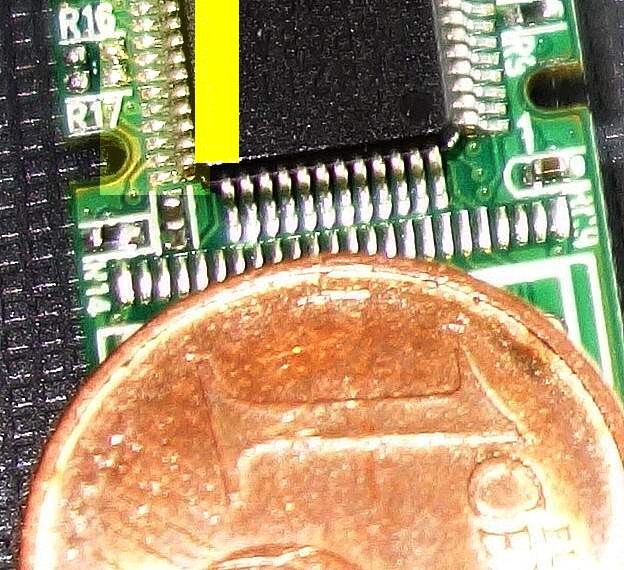 So jetzt kommt das Teil unter da Mikroskop. Nach längerer Sucherei finde ich endlich, dass die Hebelkräfte einige Beinchen eines Chips auf der Verlötung abgerissen haben (gelbe Fläche, die linken Füsschen).