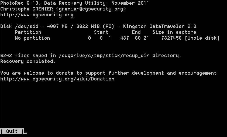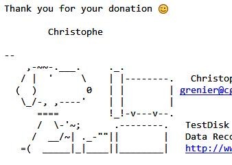 P.S.: Ein herzliches Dankeschön Christophe Grenier und sein tolles Tool PhotoRec. Walter, ich finde du könntest mal auf seinen Donation-Knopf drücken --> Link und ein paar $ spenden. Denn letztlich hat er die Hauptarbeit gemacht und ich finde, man sollte sie dann auch mal belohnen. Aber nicht übertreiben!