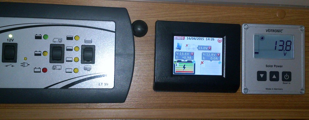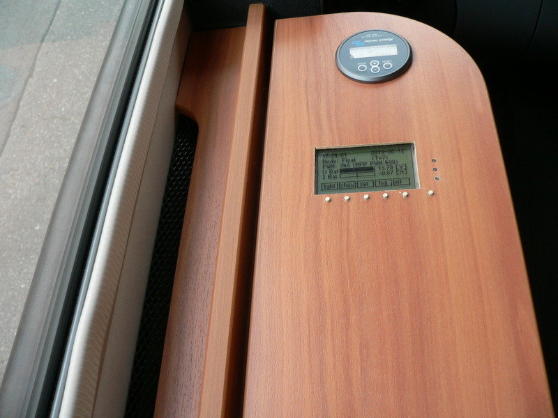 Hi rundefan, sicher nicht während der Fahrt, ich bin extrem weitsichtig und kann ohne Brille nicht mal den Tacho genau ablesen. Das ist aber im Stand mein Sitzplatz. In Vorbereitung sind noch die Gasflaschenfüllstandsanzeige und ein Wasserzähler an dieser Stelle. Das Panel über der Tür ist doch Quatsch, jedes Mal wenn Frau fragt aufstehen ? Abwasserentleerung bediene ich über Funk. Mit Fahrertür( irgend ein Ausstattungspacket) wären andere Sachen(z.B. Riesenkühlschrank) dazugekommen die ich auch nicht haben wollte, wir fahren zu zweit mit 3,5t. Der Preis ist eh utopisch gewesen. Uwe Hallo uwet, wenn Ihr aber irgendwo steht, egal ob zum Bleiben oder nur für eine kurze Pause, musst Du doch gewaltig den Kopf verdrehen, um all die Informationen ablesen zu können. Ich find die Idee ja auch genial, auch die Möglichkeit, den Abwassertank mittels Funkfernbedienung zu entleeren sowie eine Übersicht über Tankinhalt Frischwasser und Gasflaschen zu haben, aaaaber! Ich hätte dann die Anzeigen so angebracht, dass ich sie auch bei der gegen die Fahrtrichtung gedrehten Sitzen ablesen könnte. Aber, das ist ja nun wirklich ganz allein Deine Entscheidung, wie da denn alles eingebaut wird. Ist auf jeden Fall eine tolle Arbeit. Manchmal beneide ich VI-Fahrer mit ihren zusätzlichen Einbau-Möglichkeiten, weil bei meinem TI ja nur eine Armauflage vorhanden ist, die nicht wirklich zum Basteln einlädt. Hallo rundefan, ideal wäre der Einbau gedreht um 90°, ging aber nicht. An dem Display ist ein 26pol. Flachbandkabel(wie im Computer), das sollte man dann so einbauen das es beim Öffnen des Faches wenig bewegt wird. Ist alles im Fachdeckel drin und von unten zu. Der zugehörige Solarcontroller ist unter der Ecksitzbank montiert. Uwe Welchen Controller hast Du??? Morningstar?? Steca?? Ich suche nen Controller für 1kW Wp sowie ca. 100V Modulspannung (4 40V Module mit 245 Wp) OUTBACK FLEXMAX 80 MPPT ![]() schönen Adven Michael