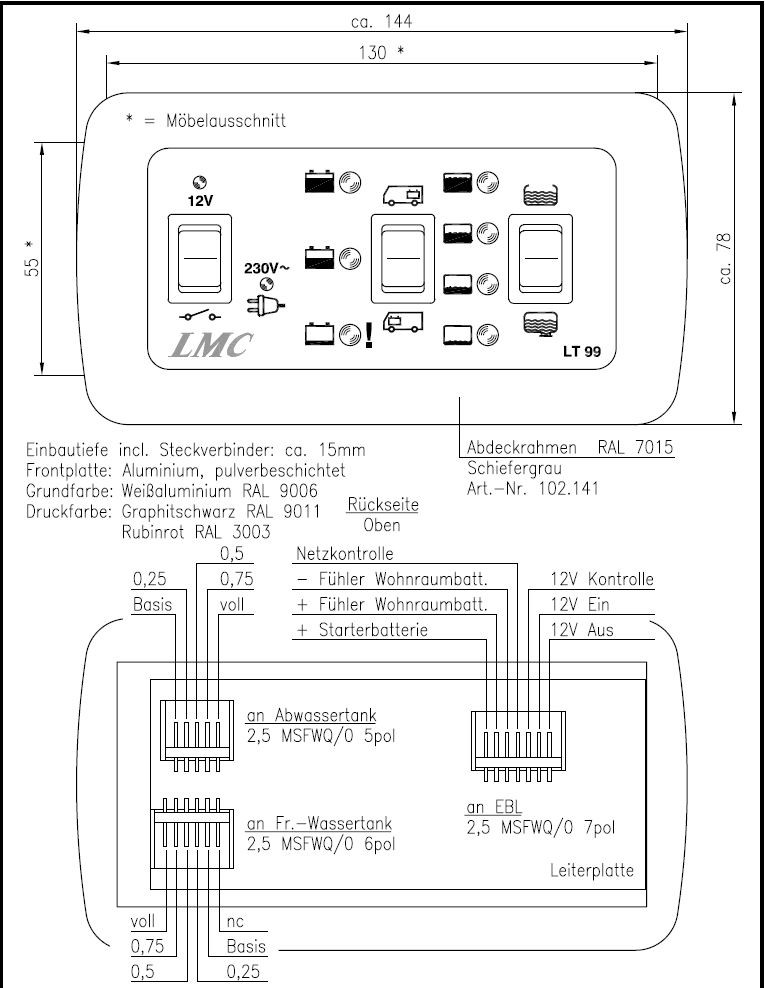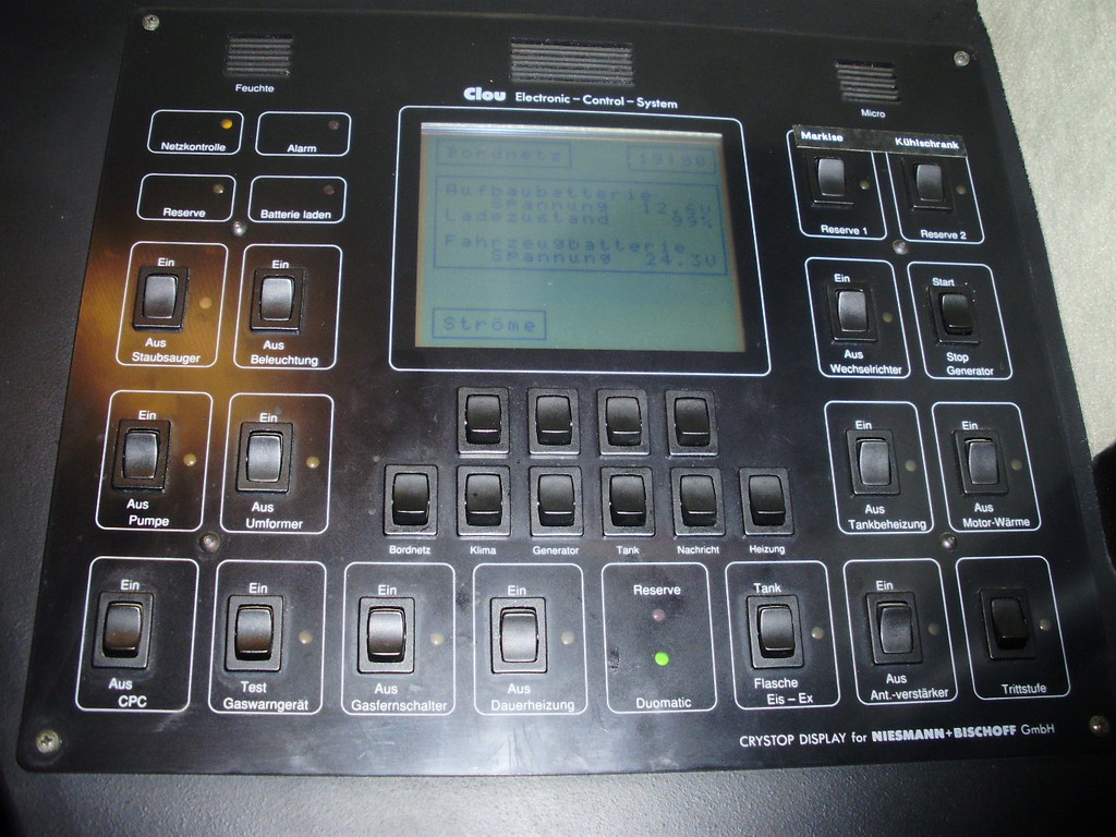 Echt gut gemacht, sogar mit Erklärung!, Super. Und alles am Mann bzw. am Wohnmobil Andreas Macht ihr eigentlich noch was anders als Kraftwerksüberwachungsgeräte im Womo einzubauen??? Ich dachte immer, ich hätte ein Reisemobil, kein Bastel- und/oder Schraubmobil. Die Winterzeit muss ja furchtbar sein. Da kann Mann wenig schrauben - sofern die Karre im kalten steht. uwet: Wenn Frau fragt sage ich: Schau selber nach - auch über der Tür. Da ist alles gut untergebracht. In EINEM Panel dass alles anzeigen kann. Unverständliche Paul ![]() FFB Tabbert 680 Classic ![]() hat sich in den letzten 20 Jahren wohl einiges verändert. Panel aus 1995 ![]() Klar ist alles kleiner geworden, aber auch besser??? Du siehst auf einen Blick was ein oder aus ist. Durch ein modernes Menü wühlen ist auch nichts für alle. Gibt es eigentlich für die EBL99 nur das Standardpanel mit den LEDs oder auch ein anderes - mal so am Rande gefragt. Im Prinzip kannst Du jedes nehmen, das tut ja nix intelligentes. Das Panel 99 hat doch nur den 12V Taster zum Einschalten / Ausschalten (Logik ist im EBL), dann ein Spannungsmesser mit LED und Umschalter (Bordbatterie / Startbatterie) und die Anzeige für Wassertank / Abwassertank (Sonden mit unterschiedlich langen Fühlern / Schaltkontakte für die einzelnen Stände einzeln auf das Panel geführt) + ein paar Kontrolllampen. Die Leitungen sind einzeln herausgeführt. Man kann alles selber beschalten, wie man lustig ist und ein beliebiges Panel verwenden. Siehe unten Schaltplan. ![]() Herzlichen Dank für Deine Antwort und den Schaltplan. Das ist sehr nutzbringend für mich, denn die originale Bedieneinheit ist zweckmäßig, aber nicht so mein Ding. Ich möchte sie etwas "aufhübschen". |