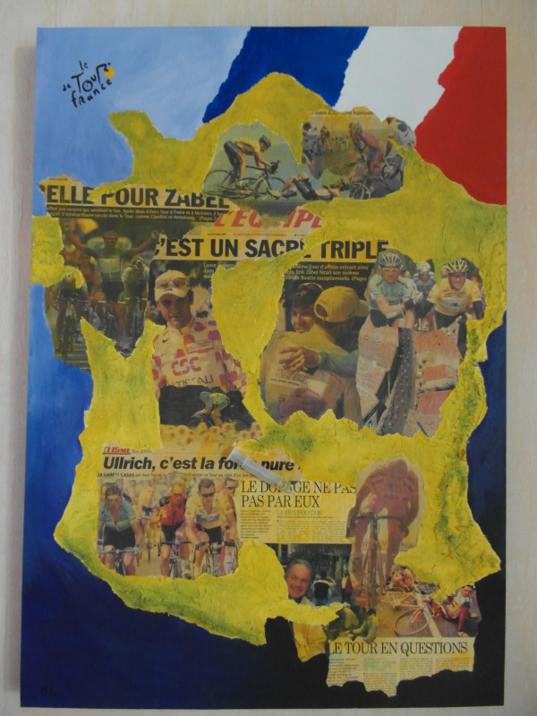 "Die apokalyptischen Reiter der Tour" eine Decollage von mir aus dem Jahr 2005 mit Ausschnitten der L'Equipe aus 2001, 2002 und 2003. Es ist keiner davongekommen, wie es sich ab 2006 gezeigt hat.