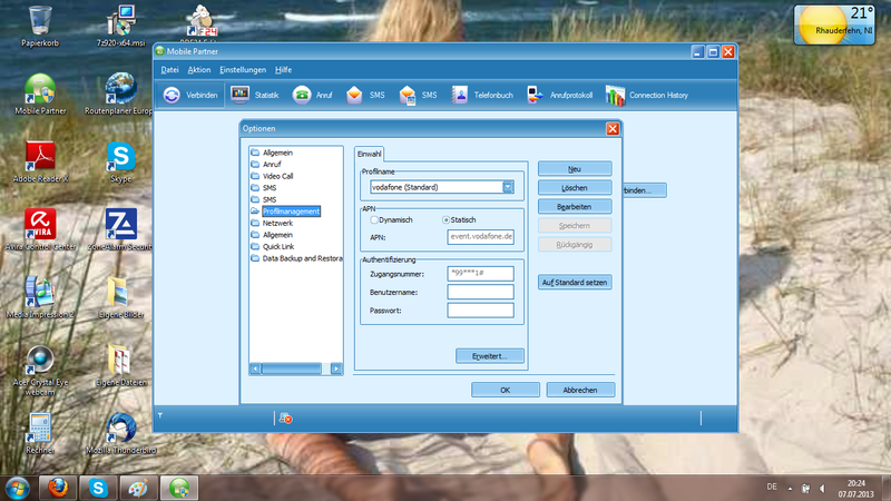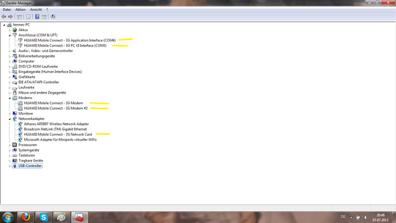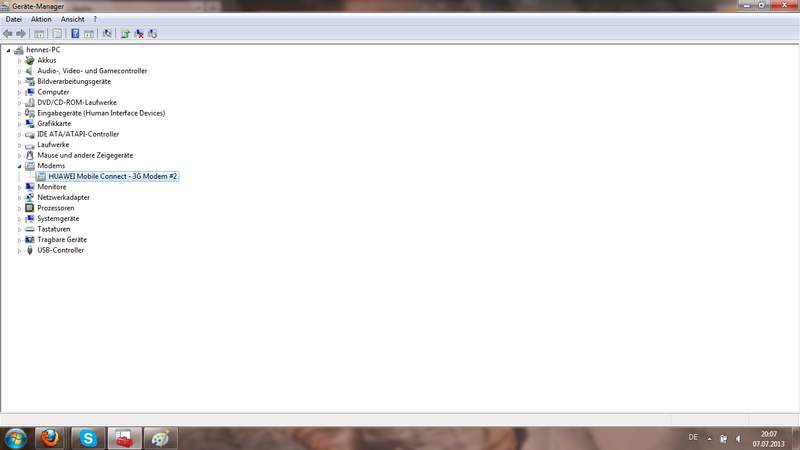 Hallo, habe wieder ein Problem :? habe einen Stick Huawei 176 mit 1&1 Karte und habe schon Stunden damit verbracht den Stick ans " laufen " zu bringen, aber vergebens :? habe schon allerhand ergoogelt aber ich bekomme es nicht hin. für 1&1 soll ich im Profilname Vodafone eingeben, APN auf statisch, Zugangsnummer *99***1# und wenn ich dann auf verbinden klicke, erscheint " Gerät nicht vorhanden oder nicht verfügbar für Hilfe wäre ich sehr dankbar :) ach so, Win7 Was sagt denn der Gerätemanager wenn Du den Stick einsteckst? Erst wenn der Stick dort einwandfrei installiert ist macht es Sinn die Zugangssoftware zu konfigurieren. Mach doch mal einen Screenshot Deines Gerätemanagers. verstehe ich dich richtig Dein PC zeigt den Stick nicht an ? Dannprobier mal erst alle USB Anschlüsse im Gerätemanager zu zu deinstallieren, keine Angst du kannst nichts falsch machen. Dann rechner neustarten, er erkennt dann alle wieder und installiert die nötigen Treiber selbst. Dann Stick reinstecken evt. wird er dann erkannt. Wenn nicht sehen wir weiter. ![]() der Stick hat sich ja installiert, wenn ich ihn einstecke wird von " Mobile Partner " ein Fenster aufgemacht. Ich versuche mal gleich ein Bild :? Ich sehe den Stick aber nicht.. Erweitere mal Netzwerkadapter.. ...meine Güte bis das funktioniert hat :? ![]()