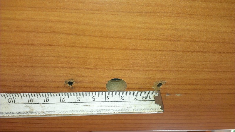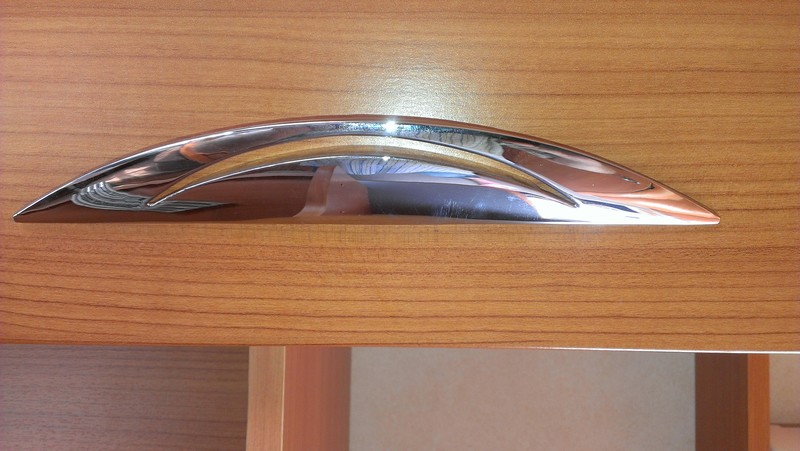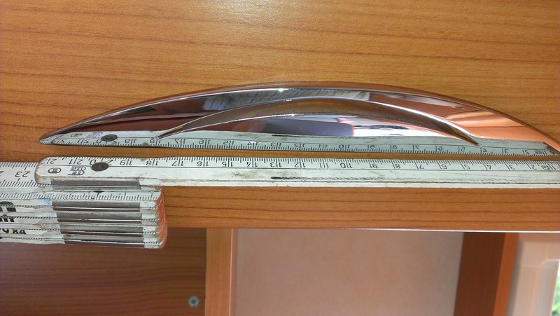 OK, die Griffe sind von Froli angekommen. Super Service. Froli liefert leider keine Schrauben mit. Also muss ich morgen an Würth vorbei fahren. Die Griffe werden mit M3 Möbelbolzen montiert. Qualitativ sind die Froli Griffen mit den bestehenden Griffen nicht zu vergleichen. Viel besser und hochwertiger. Allerdings hat sich die genaue Positionierung als äußerst schwierig herausgestellt. Das große Loch in der Mitte muss auf 20mm aufgebohrt werden. Ich habe jetzt einer Kopie meiner Oberschranktür aus Sperrholz gemacht und kann damit rumspielen. Leider muss das Froli Griff nach meinem momentanen Kenntnisstand ca 3 bis 4 mm höher angesetzt werden als das bestehende Griff. Für das große Loch ist das kein Problem, aber die zwei kleine Löcher muss ich mit Plastikholz zudecken und neu bohren. Ist nicht so schlimm da die alten Löcher vom Griff verdeckt werden. Arbeit habe ich für die ganze Wochenende da ich insgesamt 15 Griffe wechseln will.