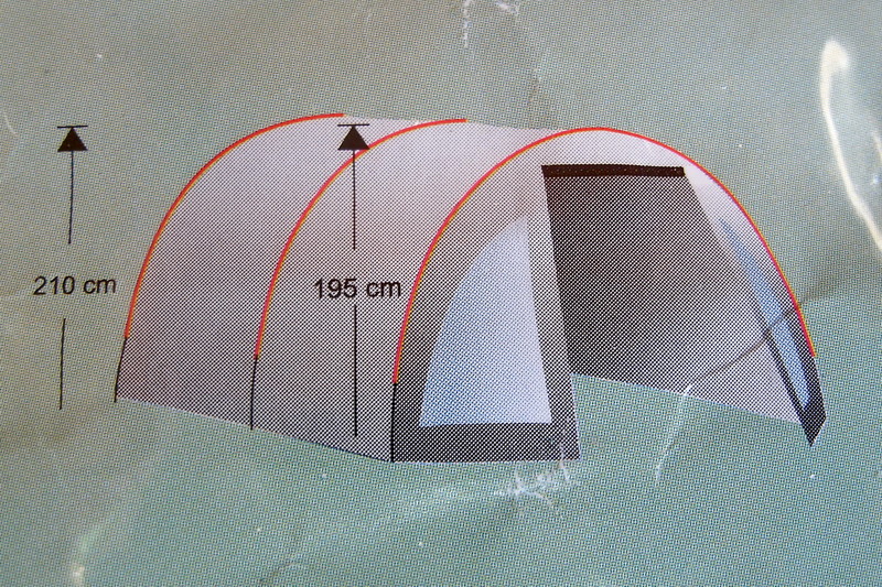 Grundfläche 3,45 x 3,15m, Firsthöhe 1,95m, Anschluß an Fahrzeug 1,70 bis 2,1m. Vorzelt steht auch durch Firststange ohne Bus.