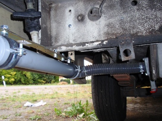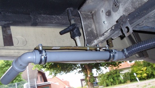 Schau Dir mal die Lösung an : --> Link Der Schlauch bleibt fest am Ablaß dran und wird bei Bedarf einfach aus dem Schutzrohr rausgezogen .. Vielen Dank euch Allen für die Anregungen. Ich denke, da habe ich nun erst mal wieder Futter ... werde berichten, wenn ich was gebastelt habe :-) Christian Moin zusammen, nach den vielen hiflreichen Tipps habe ich am Wochenende mal ein wenig gebastelt und eine meiner Meinung nach gut brauchbare Lösung gefunden. Kostenpunkt < 15 EUR: - HT Rohr 40mm mit Winkeln - Befestigungsschellen - Messingwinkel - Ein paar Schrauben, Mutten und Unterlegscheiben Und das ist dabei heraus gekommen: ![]() Der Anschluss an den Schieber des Abwassertanks bleibt mit einem Stück flexiblem Spiralschlauch ![]() Mit dem Messingwinkel ein Stück HT Rohr am Querträger verschraubt ... ![]() Das Abwasser kann nun bequem und gezielt abgelassen werden. Zwar bleibt die Lösung mit dem Schieber, der ein Stückchen unter dem Wagen ist, aber den kann man recht gut erreichen, wenn man sich neben den Wagen hockt. Danke für eure Tipps. Sieht doch gut aus ... :gut: .. an das Gefälle hast Du auch gedacht :) Nur da beim Flex-Schlauch, da sieht´s (auf dem Foto) nach einem kleinen Bauch aus .. Jo, da hast du wirklich recht ... aber ich kann ja die Muffe/den Winkel einfach ein bisschen drehen ... dann macht dwer Bauch Diät :-D Bei Bild 1 und dem offensichtlich nicht so gut erreichbaren Schieber kam mir ein Gedanke: Könnte man den Schieber nicht irgendwie um 90° so drehen, dass der Öffnungsweg horizontal statt vertikal ist? Mit einer kleinen Verlängerungskralle ließe sich der rote Griff dann sehr bequem von neben dem Fahrzeug aus erreichen! Rolf Hi Rolf, ja, ich hatte auch erst überlegt, ob am Schieber auch was gemacht werden sollte, wollte aber erst einmal abwarten ... er ist eigentlich noch mit erträglichem Aufwand zu greifen. Ich wollte bewusst da zunächst nichts machen, da er ja auch verklebt ist mit dem Tank, damit es dicht ist ... hatte sonst auch schon überlegt, den Schieber zu entfernen oder ständig zu öffnen und dafür einen Hahn in das Roh zu setzen. Aber erst mal folgt nun die Erprobungsphase des aktuellen Standes ;-) Christian hallo; isch war leid über diesen aufangbecken fürs abwasser in die knie zugehen!! also meine lösung: ein elektr. ventil von O-mark und eine aus dem kühlwasserkreislauf elektriche 12 volt pumpe!! im unterteil meines rückspiegels sehe ich mein ablassrohr und wenn dem ablassschacht ist: pumpe einschalten und wasser marsch: 100 liter in 4 minuten!! eine echt saubere sache!! mfg KH