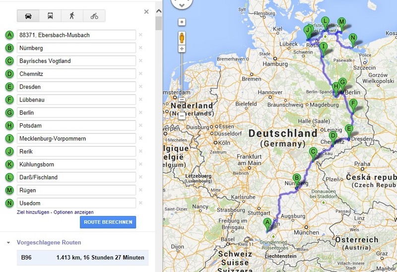 Hallo! Da ist es natürlich schwer, Euch eine Route zu empfehlen. Die direkte Strecke ist natürlich von RAV über die A 7 bis Hamburg und dann nach Lübeck und zur Ostsee. wenn Ihr aber in Dresden einen Stop einlegen möchtet, würde ich am Kreuz Feuchtwangen/Crailsheim auf der A 6 nach Nürnberg fahren und dann auf der A 9 bis Dreieck "Bayerischses Vogtland" und auf der A 72 bis Kreuz "Chemnitz". Auf der A 4 dann weiter bis Dresden. Allein für diese Strecke solltet Ihr ruhig 2 Tagesetappen einplanen. Für einen Stellplatz schaut doch selbst einmal auf die Stellplatzkarte --> Link (einfach den Kartenausschnitt vergrößern und auf die Symbole klicken) In Dresden bietet sich der SP der Firma Schaffer-Mobile in Dresden-Kaditz an --> Link Von hier ist die Innenstadt mit ÖPNV gut erreichbar. Nach ein paar Tagen in Dresden könnt Ihr dann den nächsten Stop z.B. im Spreewald einlegen. Als Basis bietet sich dieser Platz an: --> Link Viel Natur erwartet Euch im Spreewald, ein paar Anregungen könnt Ihr meinem Reisebericht in die Region entnehmen --> Link Wenn Ihr dann genug Natur gehabt habt, bietet sich ein Abstecher in die Hauptstadt Berlin an. In Potsdam könnt Ihr Schloss Sanccouci anschauen, in Berlin lockt natürlich die Innenstadt. Ich war auf meiner Tour auf diesem SP --> Link und habe eine 5-stündige Schiffahrt von Tegel ins Regierungsviertel gemacht. Das war recht gut. Von Berlin gibt es dann mehrere Möglichkeiten an die Ostsee zu kommen. Ich denke, Ihr werdet noch viele weitere Tipps bekommen. Ich wünsche Euch viel Spass auf der Tour. Hallo frankjasper8 Danke für deine schnelle Antwort :top: ,werde morgen versuchen alles zusammen zustellen! Hallo Hill1, es gibt so viele schöne Orte zwischen hier und der Ostsee, die kann man gar nicht mit einem Post alle erwähnen - was interessiert euch denn am Meisten? Mittelalterliche Städte wie RV? Fachwerk? Thermalbäder? Hallo Am besten kleine Dörfer oder Städte mit einem Badesee ,was auch wichtig ist die Natur . So wie mecklenburgische seenplatte. :lol: Einfach das leben genisen. PS: wir beide gehen auf die 50 zu da sind Disco und so nicht wichtig. ![]() Bild Upload: [/img] So wurde jetzt die Route aussehen; Für weitere vorschläge bin ich offen!