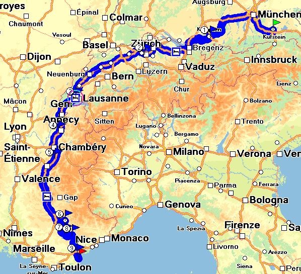 Ich denke, das ist das eigentliche Problem. Meine Route ( siehe Bild im 1. Post von mir ) geht ja fast über die von Dir beschriebene Route. Die optimalere erscheint aber nicht nur mir eben die über Italien zu sein. Warum zunächst mehrere hundert km nach Westen rollen, um dann nach Südosten in grobe Richtung Canyon du Verdon zu fahren.