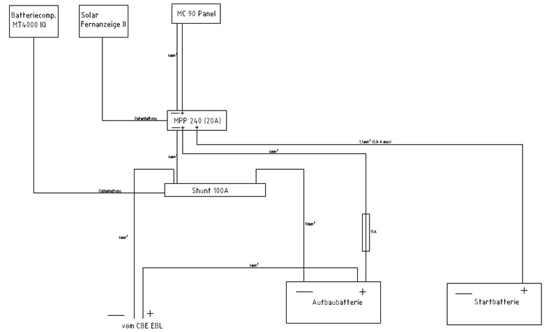 die Ladeleitung von der Lima kommt (über den EBL) direkt über den Shunt des Batteriecomputers an die Aufbaubatterie, ebenso separat die Ladeleitung (20A) des Solarreglers. Ich habe die Sicherung der Ladeleitung des Solarreglers gegen eine 25A getauscht, dann ist die 20A Sicherung des Solarreglers rausgeflogen, die erhöhe ich ohne das OK von Büttner erstmal nicht. Ich habe zwar 4mm² Kabel verlegt aber ohne die Ursache genau zu kennen will ich erstmal nichts riskieren. Wenn ich so mittags gefahren bin wo der Akku schon gut voll war ist nichts passiert, da die Lima nur noch 8-10A geladen hat (Anfangs).