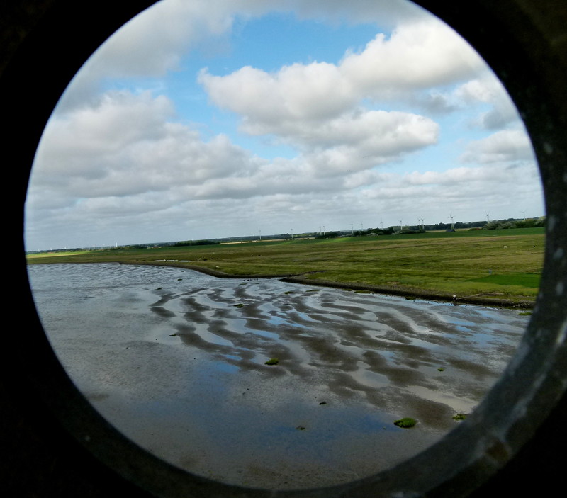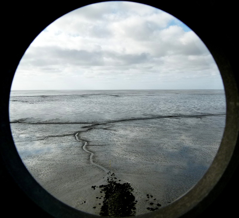 Blick durchs "Bullauge des Leuchtturms" ins Wattenmeer