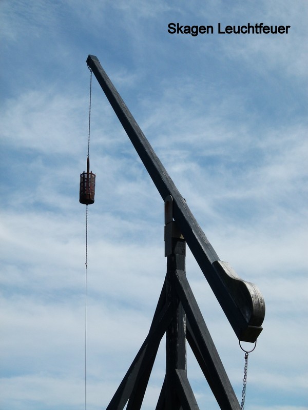 Dr Korb wurde mit Brennholz beladen, angezündet und dann hochgezogen. Dieser Vogang lockte auch häufig Sommergäste an, wie auf einem Gamälde im Skagen Museum auf einer großen Leinwand gezeigt wird.