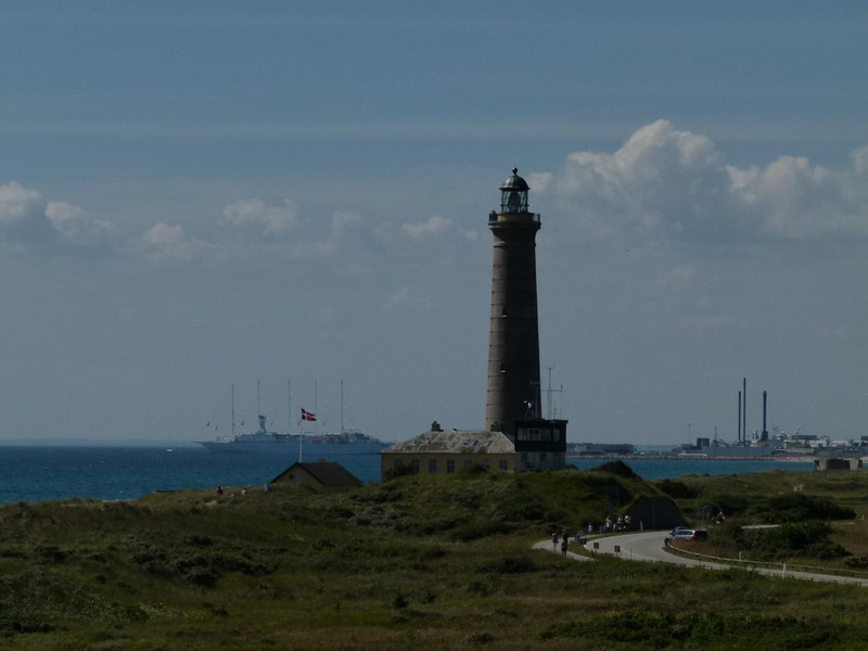 Auf dem Weg nach Grenen fährt man am Leuchttrum von Skagen (Nordseeseite vorbei. Im Hintergrund ein Kreuzfahrtschiff. Dementsprechend viele Menschen hielten sich auf der Landzunge auf.