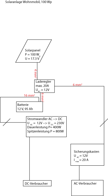 Für die Elektroinstallation in meinem Renault Master habe ich ein einfaches Schema gezeichnet. Darf ich die Experten bitten, die Dicke der eingezeichneten Kupferleitungen zu überprüfen? Die Leitungen sind alle max. 1 m lang, je Pol. Einzig die Solarkabel sind ca. 4 m lang.