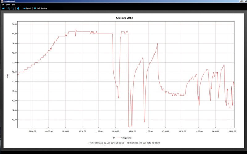 Keine Ahnung, ob Dich das hier beruhigt :wink: War mal ein Tag in Montalivet. Siehste schön, wie die Spannung auf ~12,2 V absackt, wenn die Padmaschien ihre 72 A aus den Batt. saugt. Und das sind bedeutend mehr, als Deine lächerlichen 0,6 V :wink: Habe allerdings auch nur 210 Ah. ![]() danke für die Grafik. Bist du sicher, dass da alles ok ist? :D :nixweiss: ...wenn's so weiter geht...dann eher nicht. :D gestern schwankte die Spannung zwischen 12,5-12,6V, voll ist bei mir 13,0V. Also denke ich halbleer? Habe dann das Netzkabel angeschlossen. Die Spannung stieg dann bei 13 Grad Aussentemperatur schnell auf 14,5V. Geladen wurde aber nur mit 20/60A. Da hätte ich jetzt eine stärkere Ladung erwartet. im nachherein denke ich jetzt, dass die Batterien schon stark gealtert waren und nicht mehr genug Kapazität hatten. Dieser Wagen scheint neue Batterien zu haben (3x130Ah Gel), auch wenn abends 5 Stunden die Glotze läuft und noch Kaffee gekocht wird, habe ich morgens noch 13-13,1V. Der einzige Unterschied ist, dass jetzt kein Kompressorkühli mehr läuft, sondern Absorber. Thomas Das heisst dann, dass Du wohl in den nächsten Monaten das Fahrzeug noch nicht wechseln musst ... :wink: