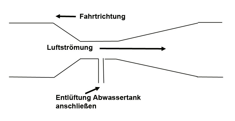 Ich sag mal ja, denn der Abwassertank hat zu viele Öffnungen zum Wohnraum hin mit den Abflüssen in Küche, Bad und Dusche. Damit die SOG da einen Unterdruck aufbaut, müsste sie ständig laufen und würde immer die Siphons leersaugen. Dann müffelts in dem Moment, wenn der kleine Lüfter in den Elektrohimmel kommt, was wahrscheinlich recht bald der Fall ist. Neben der chemischen Keule hilft gegen Müffeln aus dem Tank: Wasser in die Syphons laufen lassen, Stopfen reinmachen und regelmäßig leer machen. Von Tipsel hab ich aber gelernt, dass es an manchen Waschbecken auch Überläufe gibt, aus denen es gern herausmüffelt. Aber die müssten eigentlich auch mit dem Syphon in Verbindung sein. Nur da hilft eben der Stopfen nichts. Beim Klo gibts nur eine Öffnung zum Innenraum (Schieber) und die ist auch nur kurz offen und in dieser Zeit läuft der SOG-Lüfter und kann auch was ausrichten. An Toiletten mit mobilen Tanks habe ich bis jetzt alles durch, was es gibt: Tragbares Porta-Potti im VW-Bus. Da hab ich immer brav nach Anleitung Chemie reingemacht. Meistens war das Ding unauffällig. Eigenbau-SOG im Benz, da war allerdings der Lüfter relativ schnell kaputt, es ging aber auch ohne ganz gut. Vor allem nie Probleme beim Fahren im Gebirge mit unterschiedlichem Druck im Tank und außen. Das kann übel ausgehen ohne Druckausgleich. Jetzt eine Kassette (noch) ohne SOG, aber ich mach auch keine Chemie rein. Druckausgleich sollte man machen, möglichst vor Benutzung bei geschlossenem Deckel. Ansonsten macht sie sich nur bemerkbar, wenn der Tank schon ziemlich voll ist. Es löst sich aber auch ohne Chemie alles auf, wenn ich kein dreilagiges Super-Soft-Klopapier nehme. Schönes Thema das... Rundefan/Werner: Die Skizze stimmt schon so, der Fahrtwind wirkt gegen die Fahrtrichtung. Der Anschluß der Unterdruckleitung müsste aber kurz hinter der Engstelle liegen, das stimmt schon. Erzähl mal mehr zu dieser