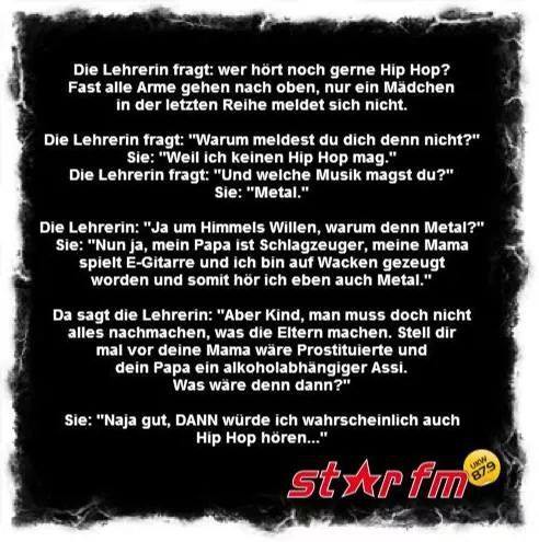 Ich war letzten Freitag beim Tattoo in Basel. War super - aber nach Wacken würde ich dennoch gehen. Alles zu seiner Zeit. Hab gestern abend mal im Fernsehen reingeschaut (aber ich geb zu, viel Zeit hatte ich nicht).... Apocalyptica fand ich auch sehr interessant. Waren die zum ersten Mal dabei? Die Kommentare zu Slayer hier im Thread haben mich etwas verwirrt - sind die eher unbeliebt in Wacken? (ich kenn mich in der Szene halt nicht aus) Das nicht. Der Auftritt war etwas "grottig" (wobei auch da natürlich die Meinungen auseinander gehen). Hm. Mhm. Wie würdest du denn nen guten Auftritt (von wem auch immer) dann beschreiben? Wie muss ein Auftritt / die Songs / die Band sein, damit es auf dem Festival gut ankommt? für mich ist ein guter auftritt,wenn man der band die spielfreude ansieht und interaktion mit dem publikum macht.und da waren HATEBREED und vor allem 5 FINGER DEATH PUNCH aber sowas von vorne dabei :D :D :D