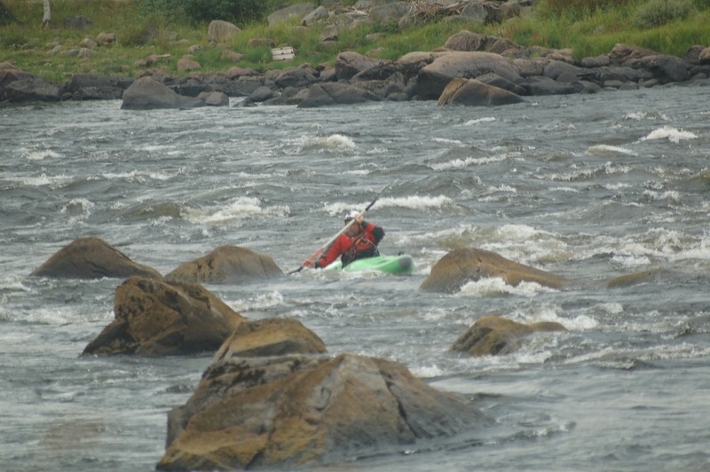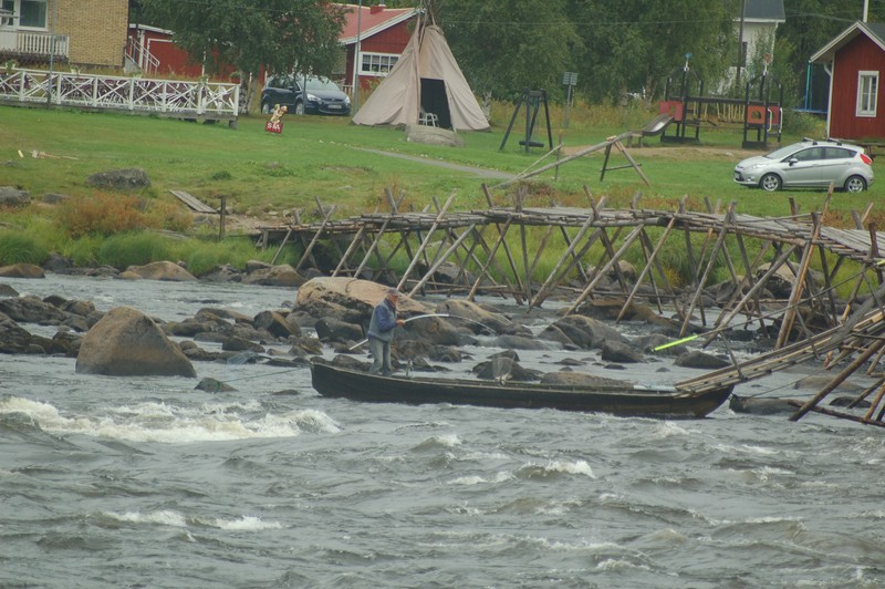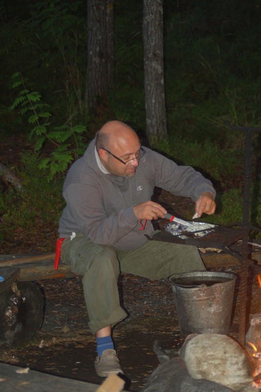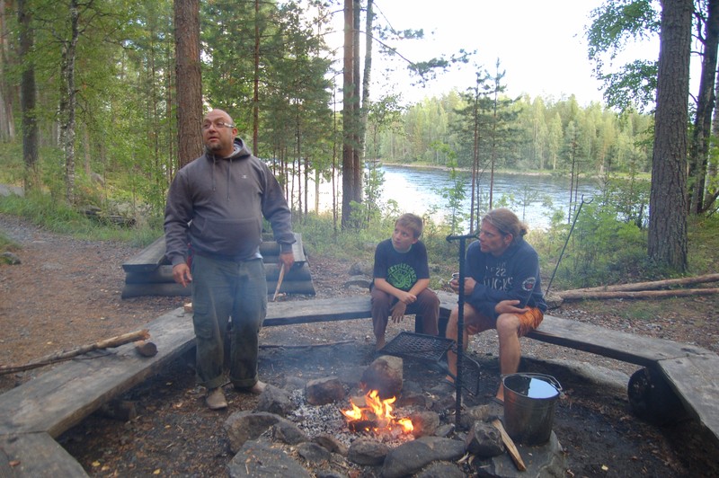 Wir fahren weiter, bis nach Lieksa, dort zum Fähranleger. Diesen erreichen wir in der Mittagszeit und das Wetter klart wie auf Bestellung auf. Die Kinder entdecken ein Volleyballfeld und stürzen los zum Volleyballspielen. Christian schließt sich an und zerschießt sich selbst versehentlich seine rahmenlose Brille, so ein Pech! Chris vertäut die Boote Klaus fährt mit Anna los und informiert sich über die örtlichen Wildwassermöglichkeiten. Am Abend teilt er uns via SMS seinen Standort mit und mit einigen Schwierigkeiten (falsche GPS-Daten, Funklöcher, ausfallendes Navi etc.) stoßen wir wieder zu ihm. Der Standort bietet ein Klohaus, Mülleimer und einen Lagerfeuerplatz mit Picknicktisch und Eisengeschirr (Pfannen, Töpfe) um über dem selbst entzündeten Lagerfeuer zu kochen. Außerdem ist in einem Schuppen ein großer Holzvorrat und sogar ein Hackklotz mit Beil! Klaus wird von einem finnischen Angler ein großer Fisch geschenkt, den er Abends auf dem Lagerfeuer grillt. Wir sitzen trotz der erstmals gehäuft auftretenden Schnaken am Feuer zusammen, ehe wir alle müde ins Bett fallen.