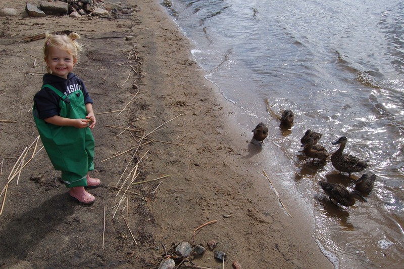 Wenig später werfen die kleineren Kinder Steine ins Wasser. Theo trifft dabei mit einem größeren Exemplar die Brücke, es prallt ab und trifft Birgit, die sich gerade zu Edda beugt am Kopf. Eine kleine Platzwunde oberhalb der Braue, eine Riesenbeule und Kopfschmerzen sind die Folge. Ich komme hinzu und untersage Theo und Lars das Steinewerfen. Theo fehlt jedes Verständnis, er ist sich weder der Gefahr noch dem Erfolg seines unabsichtlichen Tuns bewusst. - Nur wenige Zentimeter daneben und er hätte Edda, seine kleine knapp 3 jährige Schwester getroffen und das alles in unmittelbarer Ufernähe.