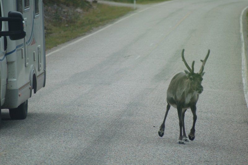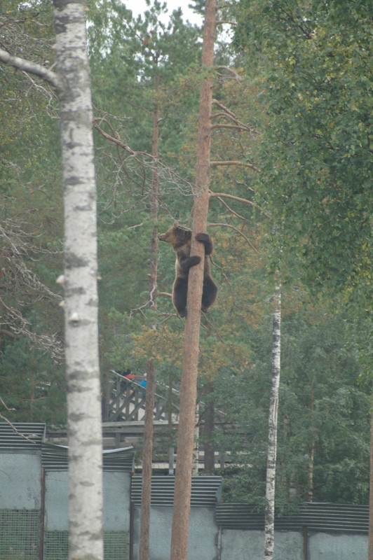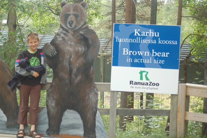 Wir fahren weiter, heute wollen wir bis Ranua und dort den Zoo besuchen. Zuerst aber tanken wir in Kuusamo 60 Liter Diesel und Frischwasser. Dann gehts weiter. Auf der Fahrt stehen immer wieder Rentiere auf der Fahrbahn oder laufen unvermutet auf diese. Einige Male müssen wir scharf bremsen und anhalten, um die Tiere passieren zu lassen. Klaus hat sich in unserem Konvoi weit zurück fallen lassen und ihm rennt eines dieser Tiere so knapp vor den Kühler, dass er nur noch ausweichen kann. Sein Auto kommt ins Schleudern und droht umzukippen. Ein gehöriger Schreck für Familie Zanker! In der Mittagszeit erreichen wir den Zoo und besichtigen diesen. Den Kindern gefällt neben den Braunbären vor allem der Spielplatz. Wahnsinn, wie hoch der Bär in nur 20 Sekunden auf den Baum klettert! Auf dem Zooparkplatz ist das Übernachten verboten, laut "dem Schulz" soll dies auf dem 3,5km entfernten Badeplatz möglich sein. Wir finden den schönen Platz, aber ein Verbotsschild verbietet Wohnmobilen das Parken nach 22 Uhr.- Der Campingplatzbetreiber hat ganze Arbeit geleistet. Wir fahren enttäuscht weiter, 25km zum nächsten Platz des Schulz. Hier finden wir an einem kleinen Fluss eine Feuerstelle, kostenloses Feuerholz und Mülleimer. Wir sind zufrieden für heute. Am Abend schreibe ich Reisebericht, später sitzen wir noch kurz am Lagerfeuer. Auch hier sind Tausende von Stechmücken