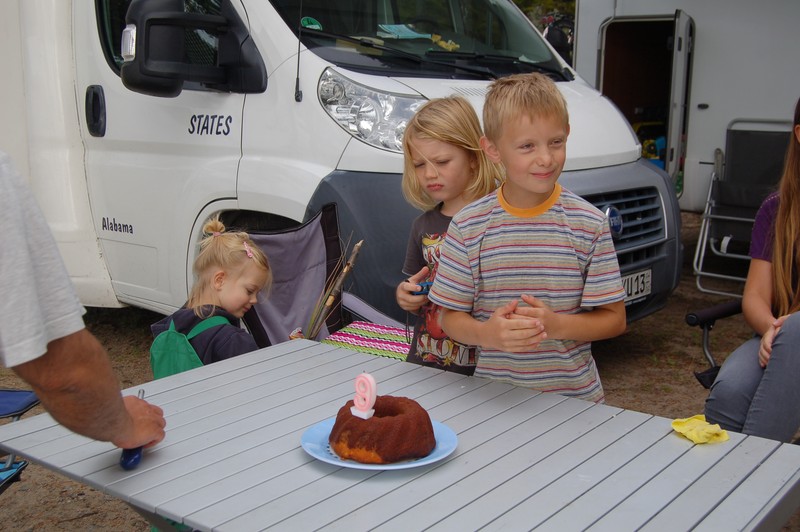 Heute wird Lars 9 Jahre alt. Wir feiern mit ihm und übergeben unser extra aus Deutschland mitgebrachtes Geschenk, das Spiel "Crazy-Campers", wie passend! Inzwischen ist es 19 Grad C warm und bedeckt, regnet aber nicht mehr. Die Jungs sausen ab und sind über 1 Stunde im See am Baden. Wir schaffen es nicht sie zu überreden aus dem Wasser zu kommen. Birgit badet mit und wäscht sich im See. Christian und Kirstin paddeln mit unseren Booten auf dem See. Der Vormittag vergeht wie im Fluge, ich schreibe Reisebericht, checke die E-mails und wir Erwachsenen unterhalten uns. Am Nachmittag geht Kleiners das Wasser aus, der Tank ist zwar noch 1/4 voll, aber die neue Pumpe reicht nicht ganz auf den Boden des Tankes. Wir füllen 30 Liter Wasser mit der Gieskanne aus unserem Tank bei Kleiners ein.