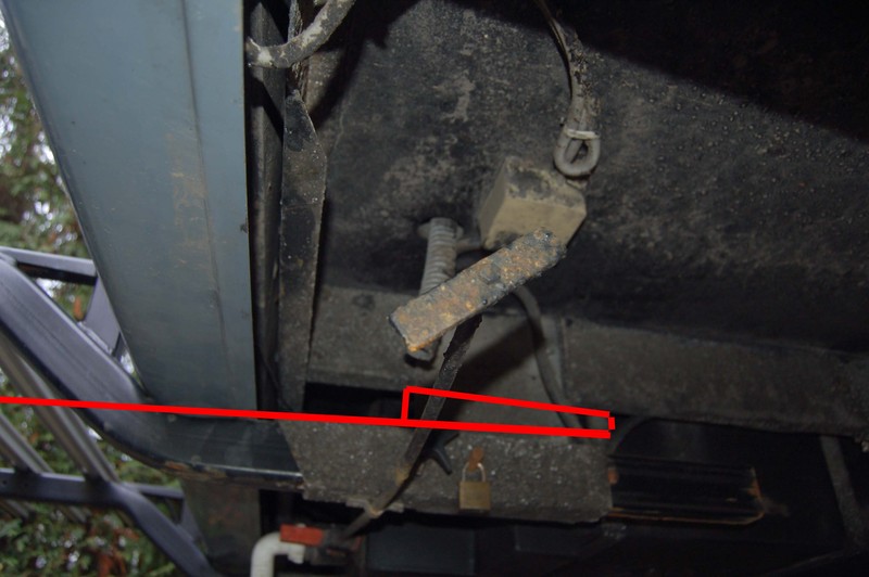da ihr Euch Sorgen macht um meine Abschleppmethode mal ein Bild (Sagt ja bekanntlich mehr als 1000 Worte) Das rote soll das Abschleppseil symbolisieren, wird um den Sawikohalter gelegt; dieser ist an der Rahmenverlängerung mit 2 19? 21? SW Schrauben angeschraubt und recht massiv. Den Radträger hatte ich gar nicht dabei, der fährt aus Zuladungsgründen im Sommer nie mit, die Halterungen auch abzuschrauben bin ich aber zu faul.