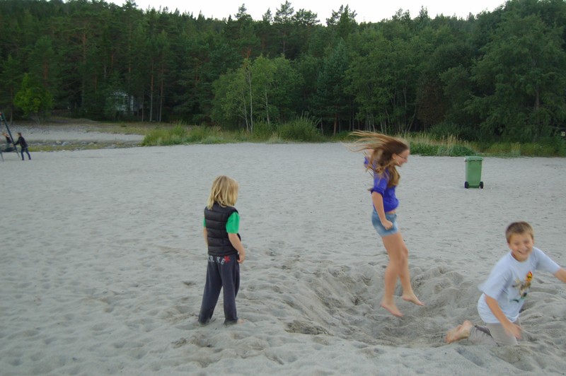 Unser Urlaub neigt sich leider schon wieder dem Ende zu und wir müssen noch mehr als 1.600km bis nach Trelleborg fahren. Also beschließen wir mal ein größeres Stück zu fahren und nehmen uns knapp 500km bis nach Härnösand vor. Den Stellplatz kennen wir von unserer Schwedentour 2009 schon. Unterwegs macht unser Auto wieder sonderbare Geräusche vom Antrieb her, immer wenn der Motor zu arbeiten hat, also beim Beschleunigen, beim Bergauffahren oder beim Fahren mit 90 / 100 km/h. - Hoffentlich hält die Technik durch bis nach Hause! Gegen Abend erreichen wir das Tagesziel, Kleiners sind wieder mal am schnellsten gefahren und ca. 1 Stunde vor uns da. Alle genießen das schöne Wetter, das 21 Grad C und Sonnenschein bietet. Die Kinder wollen eigentlich baden, zucken aber entsetzt zurück, das Wasser ist sogar ihnen zu kalt. Am Abend beratschlagen wir den weiteren Tourenverlauf. Zankers haben noch ein halbe Woche länger Urlaub als wir und wollen sich daher in Mittelschweden von uns verabschieden. Wir beschließen als morgiges Tagesziel den Stellplatz in Sala, den wir von unserem letztjährigen Schwedenurlaub kennen. Sprungturm, Volleyballfeld und der dortige See sind gute Argumente dafür.