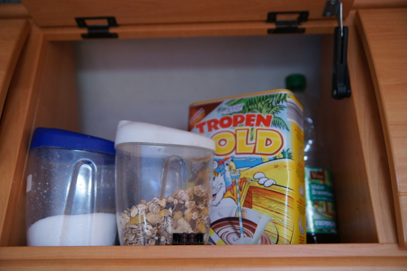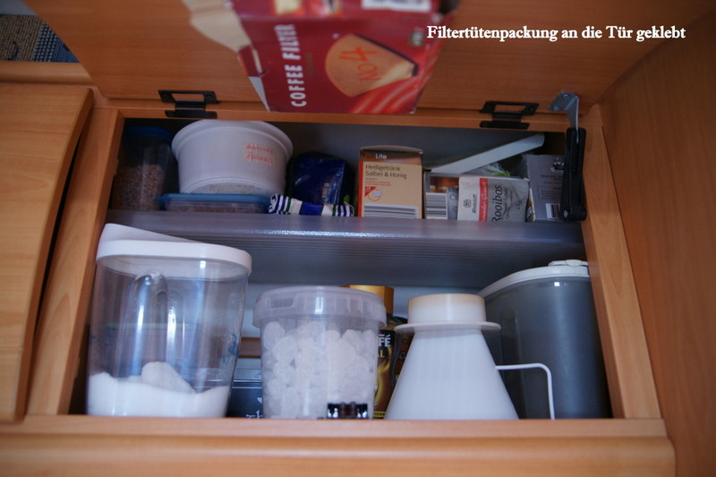 Geht bei uns schon seit 10 Jahren ohne Havarie.... :D essig + öl in plaste? :abgelehnt: kaffee ist in blech! ich hab die Originalflaschen im Schrank, eingekeilt zwischen anderen Dingen ist GsD noch nix passiert umfüllen und Kästchenlösung find ich gut. Werd ich vielleicht auch mal drauf umsteigen Hallo, Essig und Öl stehen bei uns in Originalflaschen in einem Kunststoffbehälter, bis jetzt ist noch nie was passiert :ja: . Die Lösung heisst: Apelsaft von Feinkost Aldi trinken. :D die Kunststoff- Apfelsaftflaschen (und Osaft) fassen 0,3 l und haben einen recht große Einfüllöffnung. Es passt ein Kaffelöffel durch. Die Banderole ist nicht vollflächig verklebt. Und die Flaschen sind dicht. Bei einer Reha habe ich mir immer Wasser aus dem Sprudler abgefüllt. Ca 3 Wochen nach Ende der Reha noch eine halbgefüllte Flasche entdeckt: es zischte noch.. Diese Flaschen passen in Besteckschublädeneinsätze von Curver (gibt es in verschiedenen Längen und lassen sich ineinander verhaken) Mehl, Gustin, Paniermehl Essig, Öl. - Vorräte werden darin umgefüllt: Zucker, Salz, Kaffee, loser Tee, Reis .. - Also, da kann alles rein was man gießen oder schütten kann. Jürgen Essig kaufe ich immer in kleinen Fläschen in Frankreich. Da ist die Auswahl sehr groß. Für Olivenöl habe ich mir mal Olivenöl in einer kleinen Aluflasche gekauft. Die fülle ich mir jetzt immer wieder neu. Anderes Öl, wie Sesamöl oder Sonnenblumenöl gibt es auch in kleinen dunklen Glasflaschen. Flaschen. Christel sowie gekauft in den Schrank gestellt und gut is. Hier ein paar Bilder hinten Rechts ist eine Öl- oder Essigflasche, kann ich leider nicht so erkennen, aber so kommen alle Flaschen ob Öl, oder Essig in den Schrank.![]() Ja Harry, so habe ich es auch im 1. Wohnmobil gehalten. Dann ist so eine Ölflasche im oberen Schrank umgekippt OT.: Das mit der aufgeklebten Filtertütenverpackung löst ein morgendliches Problem von mir. Hab Dank! Wir haben unzählige Flaschen und Fläschchen Öle, Essige und fertige Vinaigrette (aus Frankreich, neuester Favorit: Passionsfrucht-Mandarine... jammjamm :D ) im Womo. Glücklicherweise ist in einem der unteren Küchenschränke eine ausziehbare Schublade mit Trennern montiert, wo alles gefahrlos untergebracht werden kann. Gibts bestimmt auch zum Nachrüsten, ich meine so etwas schon mal bei Ikea gesehen zu haben. Essig, Öl u. a. Flaschen natürlich nur gut gepolstert im "Apothekerauszug" links unter der Spüle. wir haben in eine dickere Styroporplatte passende Löcher geschnitten und auf den Boden eines Schrankfaches eingepasst. Hierin stehen die heiklen Flaschen fest und können nicht kippen. wir haben unterm Herd ein schmales hohes Fach, da steht ein rechteckiges Tupperw-Gefäß, drin stehen verschiedene Essig, Öl in 1/2 l Flaschen, dazwischen hab ich andere Sachen in Kunststoffflaschen, z.B. Fensterreiniger usw. Wenns mal wo klappert, schieb ich ein Geschirrtuch dazwischen. Essig und Öl werden bei mir nicht nachgefüllt. Vor allem Ölflaschen kann man nicht richtig reinigen und irgendwann wirds mal ranzig. Ölflaschen werden optimal sauber, wenn man einen Spülmaschinentab reinbröckelt, ein halber reicht auch, heißes Wasser drauf, etwas stehen lassen, noch mal schütteln, gut ausspülen. Glänzt und ist perfekt sauber. Ihr habt mich auf ne Idee gebracht. Felicitas ißt jeden Tag frischen Salat in allen Variationen mit einer Balsamicoessig- und Ölmischung. Die extra Salatbar ist schon fertig. Jetzt zweckentfremde ich 2 dieser Portionierer direkt über der Salatbar und gut iss! :) Dann passt es auch mit der Lagerung der Flaschen. :) --> Link Aus meiner Zeit, in der ich noch Marathon gelaufen bin, habe ich div. Trinkgürtel. Die Fläschchen benutzen wir nun. Dicht und praktisch. Z. B. Amazon Link