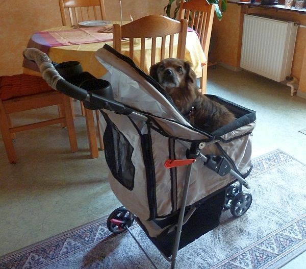 Tipsel, unser Bruno ist 13 und kann nicht die langen Strecken mehr mithalten. Wir haben uns jetzt einen zusammenklappbaren Bollerwagen angeschafft, der sehr geländegängig ist und leicht. Klappt Super, allerdings ist er nicht ganz billig, aber die Enkel nutzen ihn auch.