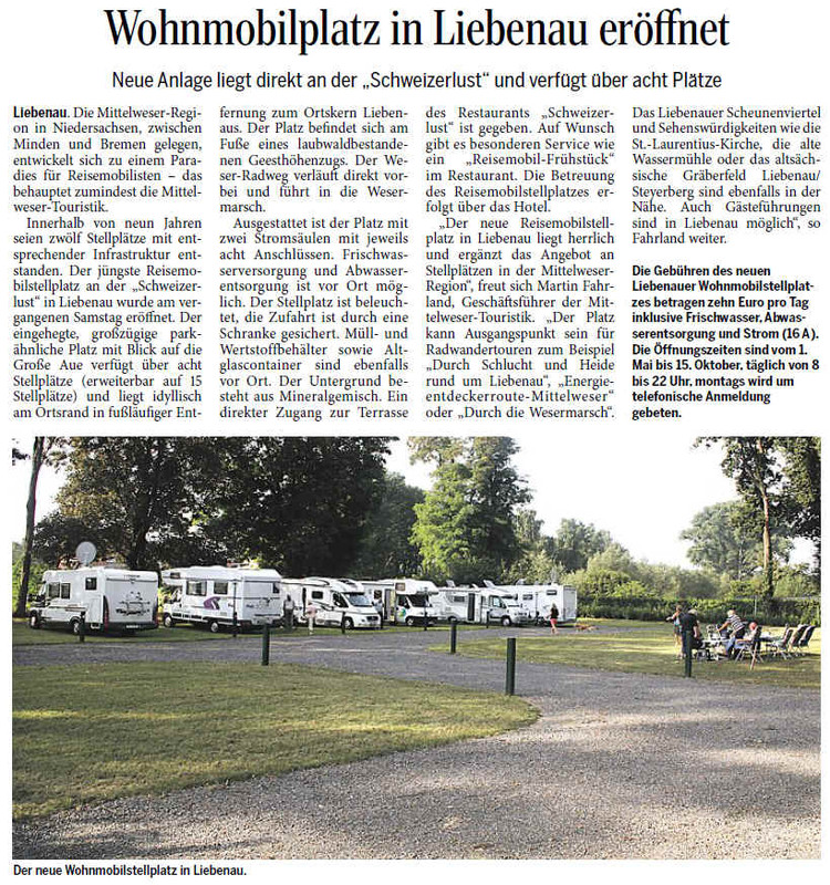 Hallo. Ein neuer Platz in der Mittelweser-Region in Niedersachsen, zwischen Minden und Bremen gelegen. Quelle: Artikel aus "Der Harke" von gestern. ![]() Weiteres siehe Link des Betreibers. --> Link Bin aber selbst noch nicht da gewesen. Moin zusammen, wir standen am 23.05.15 für eine Nacht auf dem Stellplatz am der Schweitzerlust. Es ist ein ruhggelegener Stellplatz mit 15 Plätzen unterhalb eines alten Eichenbaumbestandes. An einigen Stellen ist deshalb kaum ein Sat signal zu bekommen. Auch gibt es nur schlechten Internet empfang :P .Aber alle Plätze haben Strom. Die Zufahrt ist geschottert und man steht auf fast ebenen Rasen mit festen Unterbau. Die Plätze sind großzügig bemessen und es ist erlaubt Tisch und Stühle aufzubauen ebentso das Griffen. Es gibt eine Ver- und Endsorgungstation. Das Betreiberpaar ist nett und aufgeschlossen. Die WC Anlage des Hotels ist für die Stellplatznutzer freigegeben. Wir bezeichnen den Platz auf eine Oase der Ruhe. Von hieraus kömmen gute Radtouren unternommen werden. Der am Platz entlangfliesende Fluss ist leider wegen der starken Strömung nur abwährts zu befahren und so blieb unser Schlauch-Kanadier in der Heckgarage :cry: . Das alles gibt es zum Preis von 10€ die Nacht. Wir kommen auf jedem Fall noch mal wieder. Noch zwei Bilder vom Platz. ![]() ![]() |