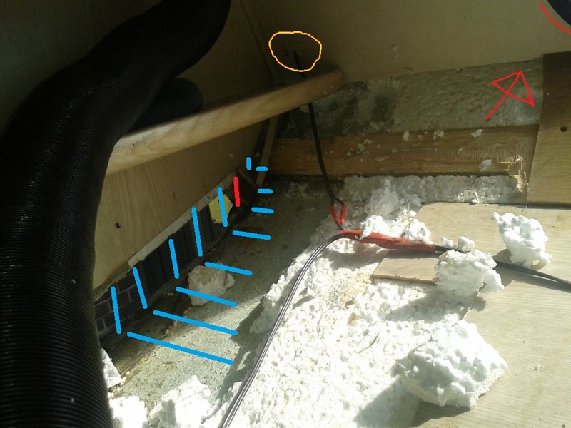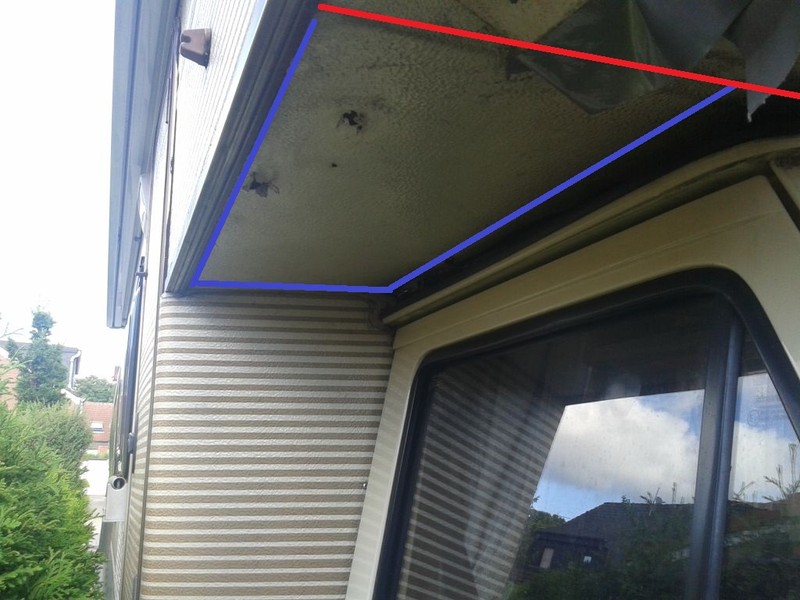 Zuerst einmal der Fortschritt: In Rot sind die neuen Leisten markiert. Die Verblechung ist an der Front auch schon wieder geschlossen. Bin ich auch recht froh drüber, da das Wetter ja zunehmend schlechter wird. Die Schatten auf der Alkovenwand sind keine Beulen, sondern Dreckpatscher von meinen Händen