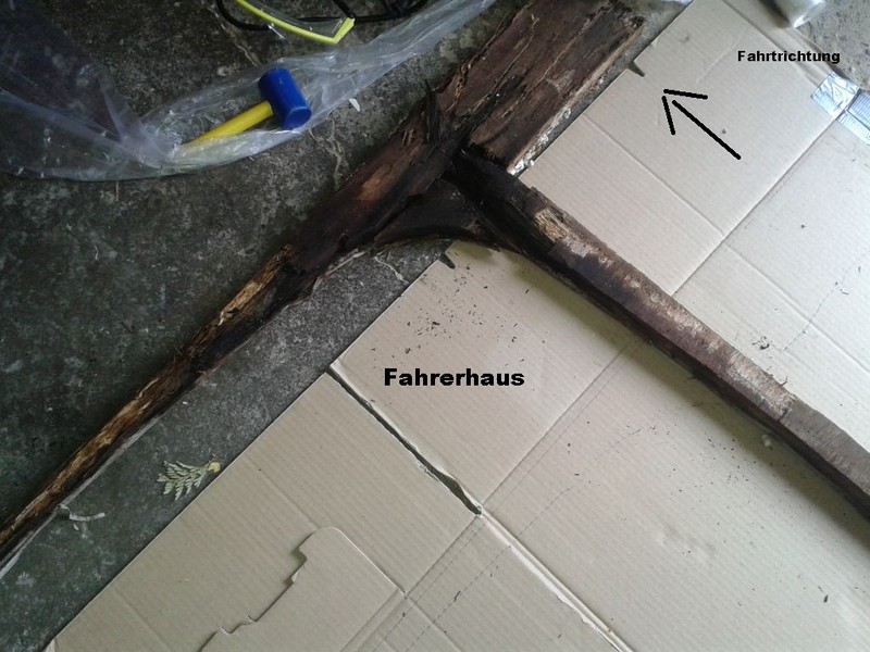 Zum heutigen Fortschritt: Im Alkoven ist nun fast der komplette Bodenbereich draussen. Dann war ich heute unterwegs, neues Holz zu kaufen. Den Rahmen über dem Fahrerhaus konnte ich teilweise retten, so daß ich die genaue Kontur abpausen kann. Aber seht selbst: