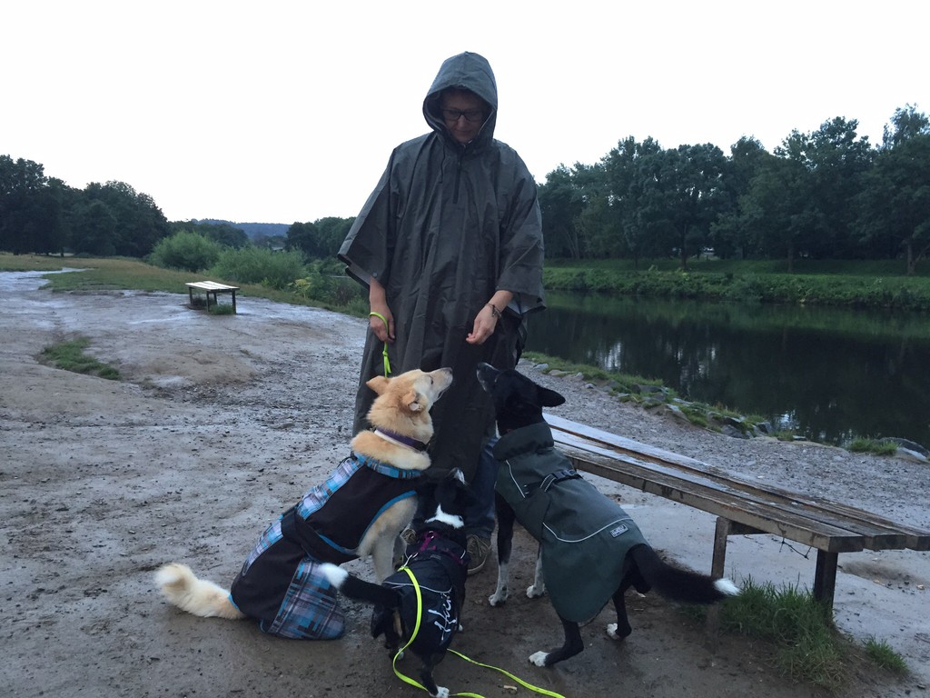 Da bleibt schon mal der Großteil vom Hundi trocken. Köpfchen und Pfötis werden dann vor dem Womi trocken gerubbelt. Und bei Bedarf gibt's auch bei uns den blauen Bademantel...