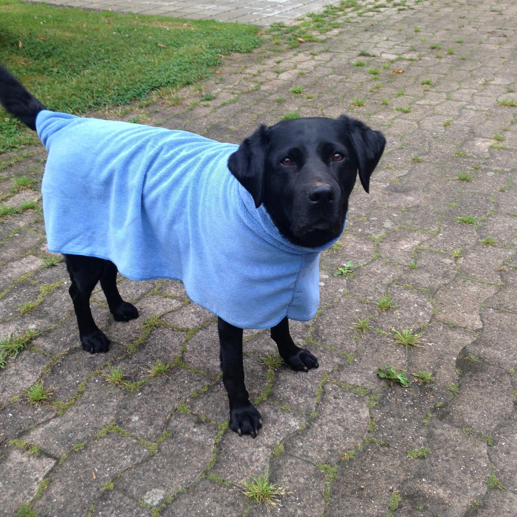 Ist bei Frieda auch so. Sie schüttelt sich auf Kommando und wird anschließend leicht frottiert..... :D Bisschen Teflon hat Archiexx auch, er muss mindestens zwei Minuten schwimmen, bis auch die Haut nass ist :-) Bei Carl kommts Wasser nicht bis zur Haut. Und weil ich das nicht wusste hab ich mir aus Handtüchern etwas größere Waschhandschuhe genäht. Damit kann man den Hund mit beiden behandschuhten Händen gezielt abrubbeln und hat nicht überall das Handtuch rumzipfeln. Wir auch :ja: So einen ganz einfachen von Trixie - den gibt es in jedem Zooladen. Ist ruckzuck übergestülpt und verhindert zuverlässig, dass der Hund beim Schütteln das Mobil versaut. Schwarzer Labbi mit hellblauem Bademantel sieht idiotisch aus :lol: aber der Erfolg zählt. Gabs den nicht in rosa?? Lololol Noch ein Tipp zum Trocknen: Unsere Wasserratte (Labrador, der auch gerne im Winter schwimmt) fährt leidenschaftlich gerne auf dem Trittbrett unseres Rollers mit. Ein paar km Rollerfahrt und trocken ist er. Franz Schwarzer Labbi mit hellblauem Bademantel sieht idiotisch aus :lol: aber der Erfolg zählt.[/quote] Hallo Eva, ja, stimmt: Sieht so richtig blöd aus! Aber der Erfolg zählt ja bekannterweise :D