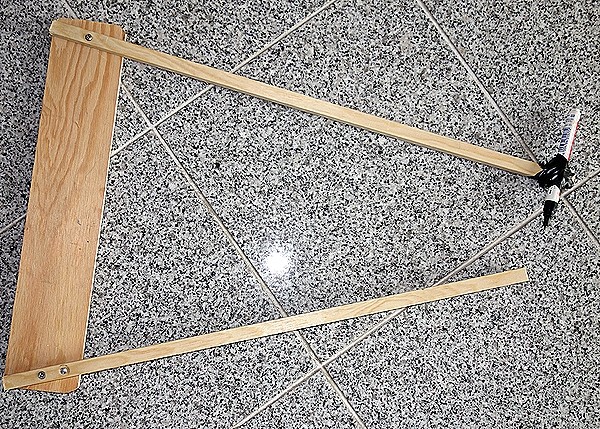 Ein Brett, zwei gerade Latten. Die eine ist mit zwei Schrauben verschraubt, damit sie sich nicht mehr bewegen kann, die andere ist beweglich.
