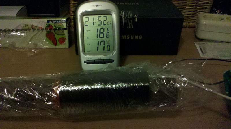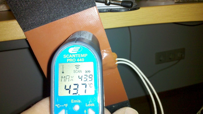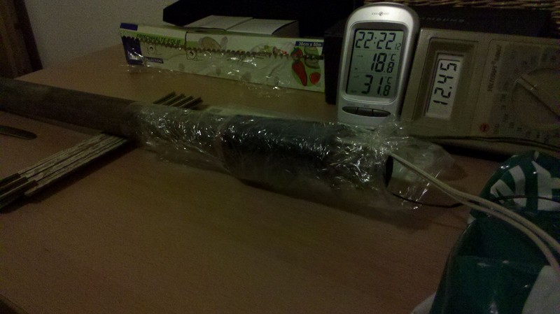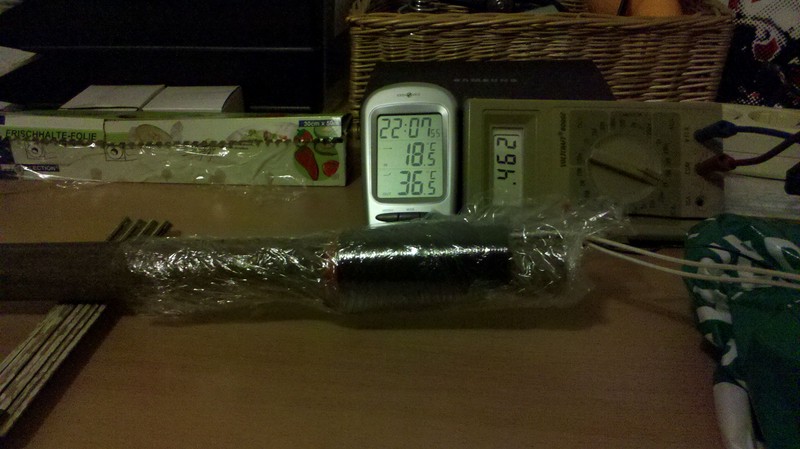 Na dann lass mal Bilder sprechen :wink: Versuchsaufbau: Heizpad wurde um ein Metallrohr gewickelt (d=34mm;4mm stark und ca 1m lang) Spannung=12,5V; => Strom=460mA; => P=5,8W Raumtemperatur: etwa 18 Grad Das Rohr war frisch aus der Garage (Temperatur: etwa 17Grad) Der Temperaturfühler befand sich zwischen Heizpad und Aussenrohr Das Ganze wurde mit 3 Lagen Frischhaltefolie thermisch etwas isoliert. Temperaturentwicklung: t=0 ==> 17Grd ( 0 ) t=3min ==> 26Grd ( 9K) t=6min ==> 30Grd (13K) t=10min ==> 34Grd (17K) t=15min ==> 36Grd (19K) Schnitt: Temperaturmessung im Innenrohr (~29Grd) t=30min ==> 32Grd innen Max. Temp. und Sicherheit: Die maximale Temperatur am Heizpad wurde nicht gemessen (mangels geeignetem Messgerät). Allerdings wird diese erst gar nicht erreicht da die interne Temperatursicherung des Heizpads den Strom unterbricht. Zitat vom Hersteller: ... The lowest using environment temperature of heating mat is -60deg C, and according to the wattage, 5-6W, it' s max. temperature will be at 45deg C. ... And the heater will come with a corresponding temperature heat protector, such as 40deg C. Nächste Schritte: Praxistest am Wohnmobil Anhänge: Bild: Heizpads mit Klettbandbefestigung (Silikonmaße: 150mm x 90mm) ![]() Bild1: Teststart (Raumtemp. 18; Rohrtemp. 17) ![]() Bild5: Rohrtemperatur und Strom nach 15 min (Messpunkt siehe oben) ![]() Bild7: Rohrinnentemperatur und Spannung nach 30 min. ![]()