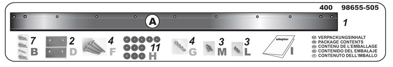 Hier noch einmal, zum besseren Verständnis, die Anbauteile. 4 Schrauben mit Muttern und Konterplatte (je 2 rechts und links) und 7 Holzschrauben dazwischen mit einer durchgehenden Aluplatte. 11 Dichtungs- oder Unterlegscheiben?