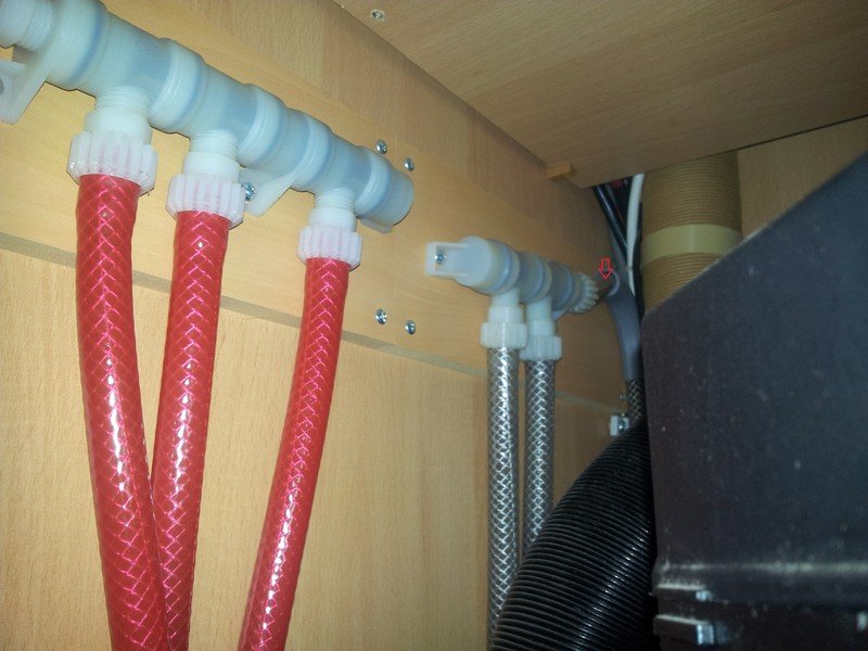 nach meiner Recherche kommt der linke untere Anschluss (am Kaltwasser) von der Pumpe, der rechte untere geht zur Küchenspüle und der Abgang mit Pfeil geht zur Heizung. Ich habe die Schläuche dort noch nicht abgemacht, weil ich die Verbindung nicht gelöst bekommen habe :roll: . Ich wollte aber auch nichts kaputt machen...