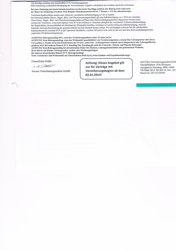 Ich habe mir von denen auch ein Angebot für das neue WoMo machen lassen. Die Accura ist aber "nur" eine Versicherungsmaklerin. Hinter meinem Angebot steht als Versicherer z. B. der HDI. Scheint günstig zu sein, wobei ich das Kleingedruckte erst noch genauer vergleichen muss, wenn alle angeforderten Angebote da sind. Schaun mer mal. könnt Ihr mal schauen, sind die Bedingungen gut, oder eher nicht. ![]()
