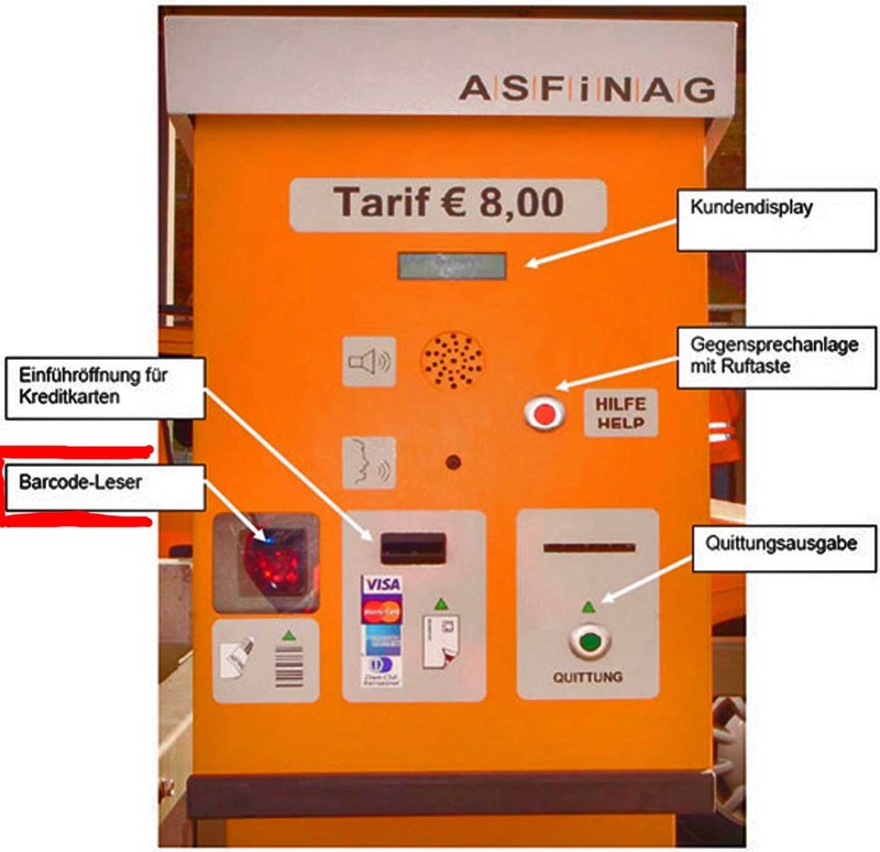 Das gäbe es öfters, dass WoMo nicht erkannt würden (NR-Schild ist am gleichen Ort wie an PKW :!: ). Ich müsse mit dem Beleg in eine grüne Spur und dort den Strichcode vor ein Fenster halten. Aber vor was für ein Fenster, sagte sie nichts. Schlussendlich habe ich wohl das richtige Fenster (Bar-Code-Leser) getroffen, plötzlich ging die Schranke hoch.