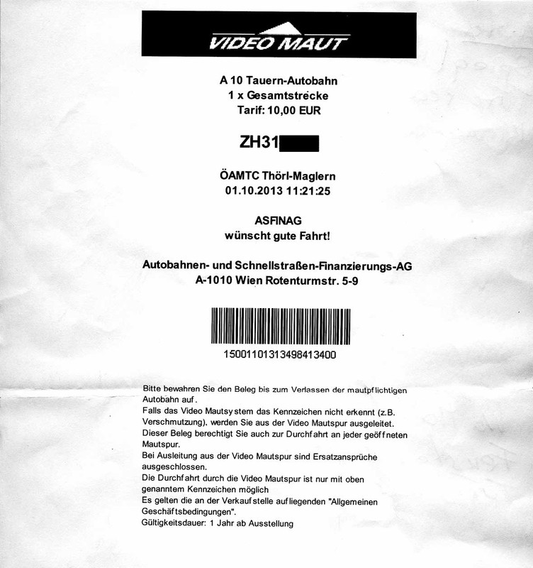 An der Grenze I/A vor Villach, nebst Vignette, ein Ticket für die Tauern-Tunnels geholt und ein Video-Maut-Ticket erhalten. Ich müsse ganz links in die Sonderspur, dort würde mein Nummerschild erkannt und ich könne ohne Anhalten durchfahren