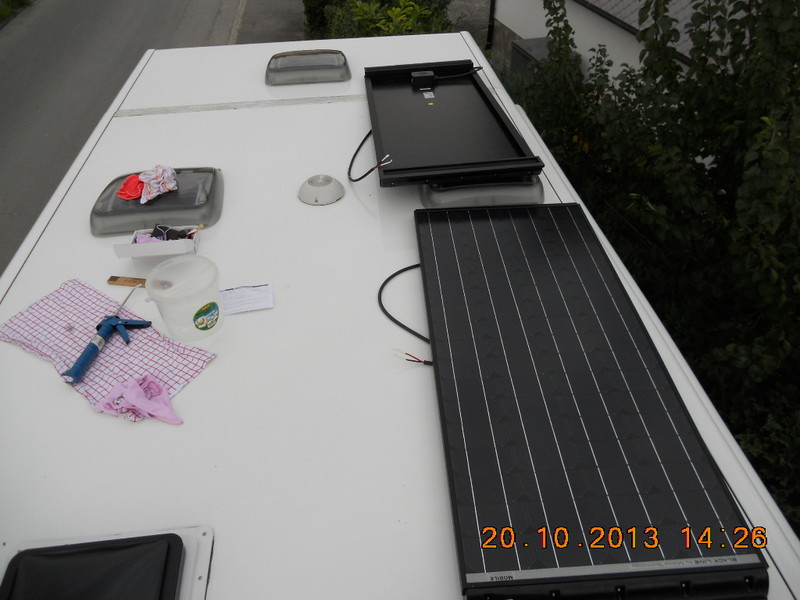 Haben lange diskutiert und viel gelesen und schlussendlich haben wir uns für eine Büttner Komplettsolaranlage 2 x 140Watt entschieden, da unser Campingheini in der Schweiz uns einen guten Preis veranschlagte durfte er die Anlage besorgen 8) .
