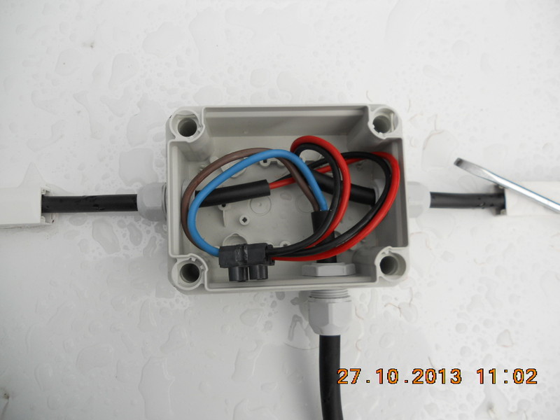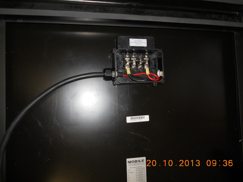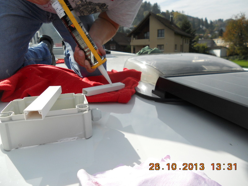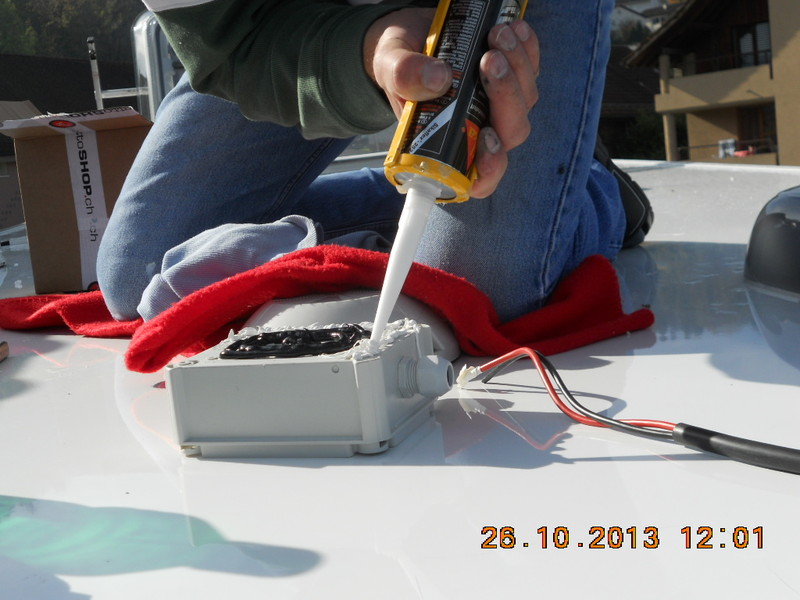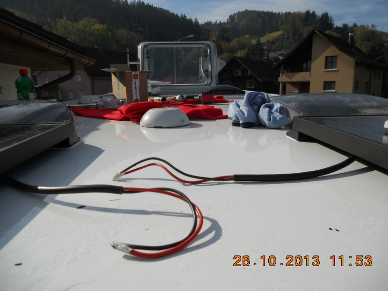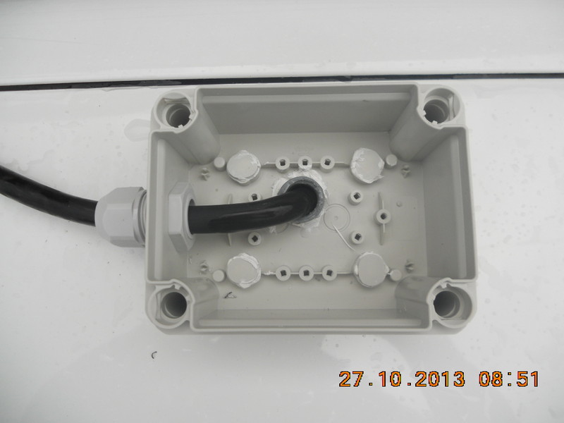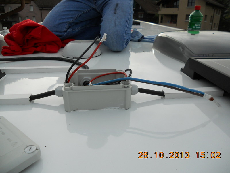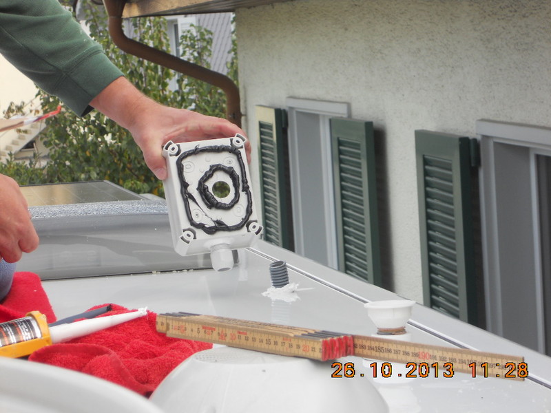 Die mitgelieferte Dachdurchführung kam uns auch etwas klein vor, für unser 2x6 mm2 nicht geeignet, drum haben wir uns selber Dosen besorgt.