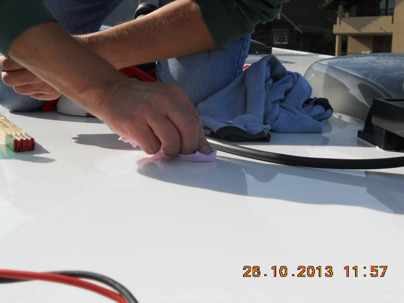 Natürlich wurde auch vorgängig wieder rege über die geeignete Montage der Platten diskutiert :D , wir entschieden uns jetzt mal vorne beim Alkoven anzufangen, hätten somit noch freien Platz nach hinten für mehr Solar wenn wir das wollten :ja: .