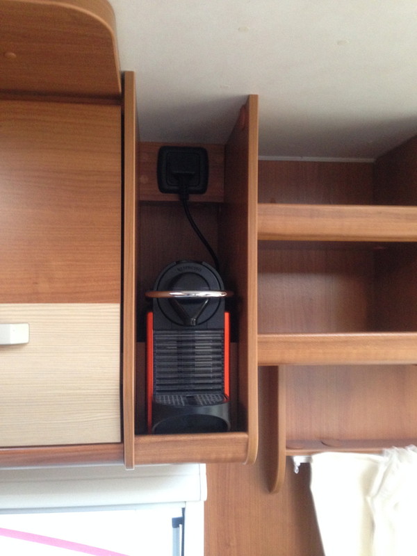 Das Highlight , wir wollten unsere Nespresso ordentlich unterbringen, eingenes, schmales Regälchen mit zus. Steckdose! Absolut suuuuuuper!!! (Muss nun nicht mehr während der Fahrt verstaut werden)