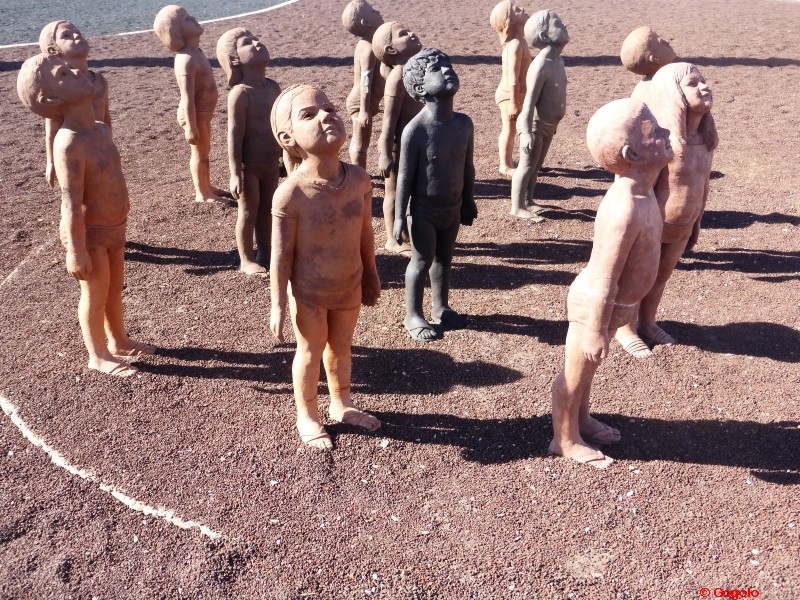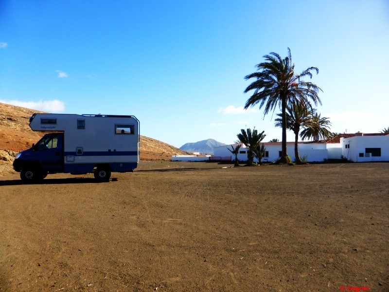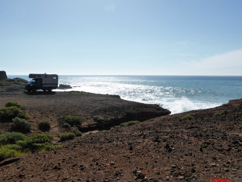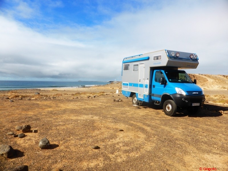 Wie und wo geht das denn? Bei Privat untergestellt oder habt ihr einen Unterstellplatz richtig gemietet. Das waäre ja auch noch ein nette Variante. Richtiger Unterstellplatz mit drei Meter hoher Mauer um den Platz, bei einer Autowerkstatt mit deutschem Besitzer ( Link kommt in meinem Reisebericht --> Link ) ät Ulrichs klasse Idee. Danke. Pünktlich um 10:30 Uhr Abfahrtszeit hat uns die Fähre der ARMAS, die Volcan de Timanfaya für 93,30€ (2 Personen + Gogolobil) vom Hafen in Gran Canaria (Puerto de La Luz, Muelle Esfinge) in drei Stunden nach Fuerteventura zum Hafen von Morro Jable gebracht. Der Wind war zwar noch relativ stark, aber die Überfahrt war nicht so schaukelig wie von Gogoline befürchtet. Sie hat trotzdem vorsorglich eine Reisetablette gegen Seekrankheit genommen. Morro Jable liegt an der Südspitze von Fuerteventura. Wir sind gleich nordwärts aufgebrochen um in ca. 15km Entfernung vom Ort zum Strand von Boca de Mal Nombre zu fahren und dort zu übernachten. Unser Übernachtungsplatz liegt auf einer Klippe gleich beim Strandlokal und wir haben eine exorbitante Aussicht auf den feinen, hellen Sandstrand und das türkisfarbene Meer. Im Strandlokal kaufen wir uns einen Cafe con Leche (Milchkaffee) und genießen die Aussicht. ![]() Der o.g. Blick, den wir von der rückwärtigen Sitzgruppe des Gogolobils aufs Meer haben ist umwerfend. Ich werde dieses Bild in hoher Auflösung künftig als Bildschirmschoner für meinen Laptop verwenden: ![]() In der Nacht hat es zu regnen begonnen. Der Februar soll ja der regenreichste Monat auf Fuerteventura sein. Macht nichts – die Luft ist schön warm und irgendwann hört der Regen auch wieder auf. Die Nacht war sehr ruhig, lediglich ein spanisches Wohnmobil steht noch in der Nähe. Mit einem ausgiebigen Samstag-Frühstück zusammen mit der tollen Aussicht beginnt der Tag schon gut. Wir fahren die gestrige Strecke nach Morro Jable wieder zurück und durch den Ort hindurch, denn wir wollen zur Südspitze der Insel, zum Leuchtturm Punta de Jandia. Dazu müssen wir auf einer Schotter- und Wellblechpiste rund 18km fahren, das macht aber dem Gogolobil nichts aus. Die Landschaft und die Straßen ähneln denen Islands und das sind wir schon gewohnt. Rechts neben der Straße sind braune, kahle Berge und links ist das Meer. Zwischendurch lassen sich ein paar wilde Esel blicken und fotografieren. ![]() ![]() Der Leuchtturm ist erreicht und er steht schön und fotogen da. Im Gebäude befinden sich in mehreren Räumen Informationen mit Bildern über Geologie, Fauna und Flora der Gegend. Sehr nett gemacht und sehenswert. Am Leuchtturm selbst ist es verboten zu campen und wir halten uns auch daran (die Standfläche wäre aber auch schief gewesen). Allerdings haben wir rund 3km vor dem Leuchtturm ein Hinweisschild auf eine „Zona de Acampar“ gesehen und unmittelbar am Sandstrand stehen auch schon ein paar Surfer mit ihren Autos. Wir fahren dorthin und haben wieder einen schönen Übernachtungsplatz ergattert. ![]() ![]() Wir hatten eine äußerst ruhige Nacht bei sternklarem Himmel von dem Millionen von Sternen funkelten. Nach einem schönen Frühstück mit Meerblick fuhren wir wieder zurück nach Morro Jable. Dort hatte ich schon bei der Hinfahrt eine Shell-Tankstelle an der Hauptstraße gesehen, der auch eine Autowaschanlage angeschlossen war. Auch ein freier, nach oben offener Waschplatz mit Hochdruckstrahler war vorhanden. Wir befreiten das Gogolobil von den salzigen Meerwasser-Gischtspritzern der vergangenen Tage (das war sehr notwendig!) und konnten dort auch gleich Frischwasser bunkern. Weil es uns gleich nach der Ankunft am damaligen Übernachtungsplatz Boca de Mal Nombre so gut gefallen hat, beschlossen wir dort eine weitere Nacht zu verbringen. Unterwegs am Ortsausgang von Morro Jable haben wir „Kunst im Kreisverkehr“ entdeckt. Die 30 Figuren stellen Kinder aus Morro Jable dar, die nach oben in den Himmel schauen und diesen nach ihrer Zukunft befragen. ![]() ![]() Am „alten Stellplatz“ ist „unser“ Platz noch frei. Prima! Wir setzen uns windgeschützt mit den Liegestühlen neben das Gogolobil und schon entdecken wir Streifenhörnchen, die herumwuseln. Wir zählen über ein Dutzend. Ich locke sie mit spanischer Haselnuss-Schokolade und schließlich fressen mir die Hörnchen direkt aus der Hand und sausen ständig zwischen meinen Füßen hin und her. Das war richtig lustig. Fast hätte ich zu fotografieren vergessen – aber nur fast. ![]() ![]() Gleich am Strand ist auch ein Lokal, als Spezialität des Hauses wird Ziegenfleisch angeboten. Das reizt uns zu einem außertourlichen Mittagessen (normalerweise essen wir mittags nichts). Ein Krug Sangria, Mineralwasser, Ziegenfleisch und zum Abschluss einen Kaffee – Herz, (Magen) was willst du mehr. Zum Ziegenfleisch ist zu sagen: die Portion war sehr groß (siehe Bild) und äußerst schmackhaft zubereitet. Und Sangria schon zur Mittagszeit macht müde, trotzdem gab es noch einen Strandspaziergang, wo ich reizvolle Sandzeichnungen durch das Meer fand! ![]() ![]() ![]() Mit dem Ober vereinbare ich noch, dass ich mir am nächsten Morgen wieder meinen Frischwassertank am Wasserhahn des Strandlokals auffüllen darf. Es ist insgesamt auffallend, wie freundlich und zuvorkommend die einheimische Bevölkerung ist. Am nächsten Morgen sind wir allerdings schon vor Öffnung des Strandlokals losgefahren und der Wasserhahn war über die Nacht abgedreht, aber das WC und das Abwasser sowie Abfall konnten wir entsorgen. Wir fuhren nach Tarajalejo, dort gab es Wasser bei einer Stranddusche. Unser weiterer Weg führte uns zum Leuchtturm Faro de la Entallada in Las Playitas. Von dort aus ist die Küste Afrikas nur noch 100km entfernt. Die Straße auf den Berg, auf dem der Leuchtturm steht, ist recht abenteuerlich, eng und mit zahlreichen Kurven. Aber der Weg lohnt sich. ![]() Wir blieben die Nacht in der Nähe von Las Salinas del Carmen außerhalb des Ortes auf einer Freifläche über dem Meer – nat