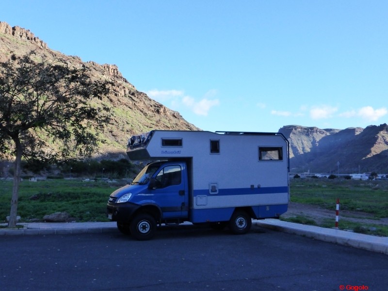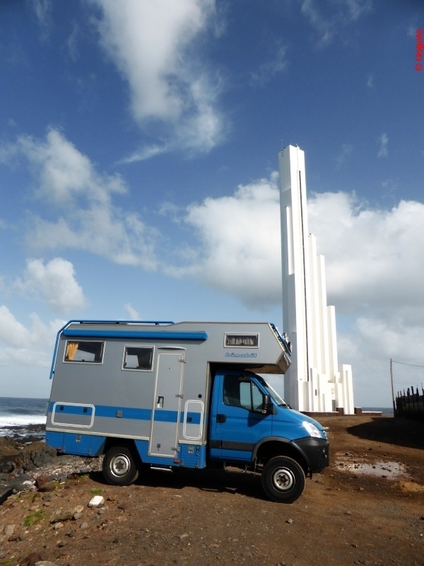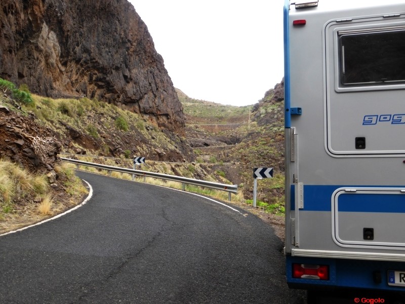 Hallo Paula und Paul, wir wollten vor ein paar Tagen den Strand von Veneguera besuchen und haben auf der Karte einen Weg von Puerto de Mogan in Serpentinen über die Berge zu dieser Bucht gesehen. Diese Straße wollten wir auch befahren, aber Polizisten, die den Weg absperrten, hatten etwas dagegen und erklärten uns, dass der Weg nicht befahrbar und verboten sei. Lediglich ein Weg nördlich von Mogan über Los Almagicos wäre möglich gewesen, so die Polizei. Dazu hätten wir aber wieder über eine halbe Stunde zurück fahren müssen und da die vorhergehende Etappe doch etwas anstrengend war (siehe bericht in Kürze) haben wir darauf verzichtet. Wir werden aber sicher wieder mal zur Überwinterung hierher zurück kommen. Habe die Ehre Gogolo Hallo Gogolo, wieder sehr schöne Bilder. Habe Heimweh! Wenn Ihr auf Lanzarote seid, ist neben dem Kaktusgarten, den ja Uli schon empfohlen hat, ein absolutes Must, den Spuren Manriques --> Link zu folgen. Die findest Du da eigentlich überall. Seine Werke finde ich einfach grandios. Auch die Feuerberge sind empfehlenswert. Liebe an Sieglinde und auch Peter lässt Euch herzlich grüßen. Die Halbzeit unserer Winterreise ist leider schon vorbei, aber viele schöne Orte und Ziele sind noch in unserem Programm… Die Fähre von ARMAS brachte uns pünktlich und sicher von Teneriffa nach Gran Canaria. Wir fuhren pünktlich um 12 Uhr mit der „Vulcan de Tamadaba“ ab, sahen noch im Hafen die MS Queen Elizabeth II, ein Schiff der AIDA-Flotte sowie den Dreimaster Alexander v. Humboldt liegen und landeten drei Stunden später in Las Palmas de Gran Canaria. Die Überfahrt war ruhig, es war sonnig mit einigen Wolken. ![]() Wir brauchen wieder Nachschub für unsere Verpflegung und Getränke, so fuhren wir problemlos gleich nach dem ausschiffen – dem Navi sei Dank – zu einem Großparkplatz beim Auditorio Alfredo Kraus, direkt an der Strandpromenade im Nordwesten der Stadt. Gegenüber dem Auditorio ist ein riesiges Einkaufszentrum das viele Geschäfte unter einem Dach hat, u.a. Supermarkt Carrefour, McDonalds, Internetanbieter Yoigo, kleine nette Cafes… McDonalds haben wir ausgelassen – das machen wir auch zuhause so. Aber bei Carrefour wurde eingekauft, bei Yoigo habe ich mein Internetbudget fürs Handy aufladen lassen und in einem Cafe haben wir eine kleine Pause gemacht. Als wir das Zentrum verliesen merkten wir, dass es draußen kräftig geregnet hatte und auch dunkle Wolken am Himmel sind. Ein starker Wind ist aufgekommen. Wir beschließen auf dem Parkplatz zu übernachten nachdem wir unmittelbar an der Strandpromenade standen und beste Sicht aufs zwischenzeitlich aufgewühlte Meer hatten. Das Wetter hält aber nicht die Jogger auf der Promenade und auch nicht die Wellensurfer von ihrem Tun ab. Für Unterhaltung ist also gesorgt, Fernseher brauchen wir keinen. Dafür sorgten auch einige Liebespaare in ihren Autos, die sich von uns und anderen Übernachtern in ihrem Treibern nicht stören ließen. Nachts war es durch das Wellenrauschen etwas laut, trotzdem haben wir gut geschlafen. 30km war am nächsten Tag unsere Etappe nach Playa de Roque Prieto bei La Atalaya an der Nordwestküste der Insel. Gerade lang genug, dass sich die Batterien für den Kompressorkühlschrank wieder voll aufladen können. Es ist jetzt immer noch windig, aber trocken und etwas bewölkt. Hier stehen wir wieder schön auf einer Klippe oberhalb des Atlantiks, unten tost das Meer und oberhalb von uns sind Bananenplantagen. Die Nacht ist sehr ruhig, aber der Himmel zieht sich allmählich zu, es wird bewölkt und zwischendurch nieselt es immer wieder. Am Morgen wird das Foto von dem schönen Ort La Atalaya durch den fehlenden Sonnenschein etwas farblos. ![]() ![]() ![]() Über Galdar und Agaete fahren wir an den Strand von El Risco (Playa del Risco). Hier stehen wir auf einem sehr einfachen Stellplatz ohne Strom und Entsorgungsmöglichkeit. Wasser gibt es aus großen 40-Liter-Kanistern. Ein kurzer Spaziergang bringt uns an den Strand – und hier ist es einfach gigantisch! Wirklich riesige Wellen – so ca. 5-6m hoch - branden an das mit großen Steinen übersäte Ufer, gischten hier über 8m auf und machen dabei einen Höllenlärm. Salzwasser hängt in feinen Tropfen in der Luft und weht weit ins Land hinein. Baden ist hier nicht nur unmöglich, sondern lebensgefährlich! Es gäbe auch die Möglichkeit, mit dem Wohnmobil noch näher an den Strand zu fahren – es wäre auch ein Parkplatz vor der Sperrschranke vorhanden – aber bei dem Lärm, das die Wellen machen ist sicher an einen Schlaf nicht zu denken. ![]() ![]() Wir bleiben daher auf dem Stellplatz, insgesamt eine gute Entscheidung. Auf den Platz kommen auch viele Spanier, u.a. eine Männergruppe von denen einer gerade Vater geworden ist. Sie richten sich häuslich ein und wir sehen schon, es wird eine feucht-fröhlich-laute Feier, denn sie packen ein Stromaggregat aus. Ich frage nach, ob ich von ihnen etwas Strom zum Laden der Batterien haben kann. Da mir das gestattet ist, revanchiere ich mich mit einer Runde guten Birnenschnapses. Nach dem die Batterien voll sind fahren wir aber 50m weg, weil die jungen Männer den Strom aus dem Aggregat für Karaokegesang nutzen wollen. Wir stellen uns so hin, dass wir das Gejohle kaum wahrnehmen. Wir wollen am nächsten Tag nach Puerto de Mogan fahren. Zunächst auf der engen und sehr kurvenreichen Küstenstraße (GC200) bis Playa de la Aldea. Und dann führt mich mein Navi auf die GC210, denn wir wollen zunächst ins Gebirge nach Tejeda fahren. War die Küstenstraße schon sehr eng und kurvenreich, so ist die Bergstrecke auf der GC210 mit vielen steilen Spitzkehren und einspurigen Engstellen noch viel abenteuerlicher. Ich rate ab, diese Strecke mit einem Fahrzeug über 7m Länge zu befahren. Wir hatten viel Glück, denn wir sind zeitig am Vormittag gestartet und es war noch nicht viel Verkehr unterwegs. Bei Gegenverkehr musste immer ein Fahrzeug zurücksetzen damit das andere passier