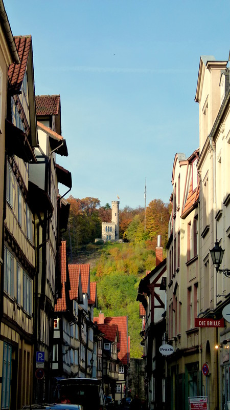 Die Tillychance ist durch die Häuserzeilen gut zu erkennen, ein Fußweg führt hinauf und die Sicht über Hann. Münden ist beeindruckend