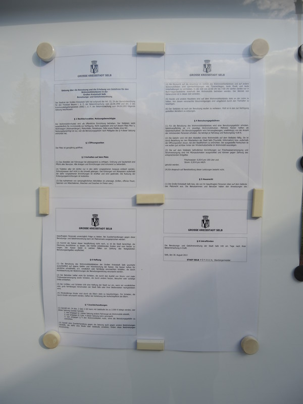Es handelt sich um den im Sommer neu angelegten Stellplatz in Selb. siehe --> Link Adresse: Papiermühlweg 2 Der Stellplat liegt zentral im Stadtgebiet, an der Haupteinfahrtstrasse der Stadt. Trotzdem Nachts relativ ruhig. In der Nähe (ca. 700m) Prozellan-Werksverkauf. Mehrere Restaurants in der Nähe. (Gute Pizzeria "Little Italy") Stromanschluss: 0,50 € pro kW/h Wasseranschluss: 0,50 € pro 100 l Entsorgung: kostenlos Sanitärgebäude mit Duschen und Toiletten (behindertengerechte Ausstattung) Aufenthalt: unbegrenzt Anzahl der Stellplätze: 10 Untergrund der Stellplätze: Pflaster Stellplatzgebühr: 4,00 € pro Tag Nicht erlaubt sind: Pkw´s, Wohnwagen (Wohnanhänger), Motorräder, Reisebusse, Zelte sowie Mobile ohne WC. Mache demnächst noch ein paar Fotos. Micha Dieser Stellplatz ist praktisch, da er sehr zentral liegt und es sowohl Duschen, Strom als auch Versorgung und Entsorgung gibt, allerdings liegt er an einer Hauptverkehrskreuzung und hat einen Wendeplatz, welcher lediglich für Wohnmobile mit einer Länge von knapp 6 Metern ausgelegt ist. Wer autark ist steht ebenso zentral, jedoch etwas ruhiger am Rosenthal Theater (kostenloser Parkplatz). Die weiteren beiden selber Stellplätze (kostenlos) sind idyllischer gelegen, einer direkt am selber Forst hinter der Eissporthalle, der andere mit guter Aussicht in Vielitz. Für Wanderer und Radfahrer würde ich den Stellplatz hinter der Eissporthalle empfehlen, für alle die eine gute Aussicht wünschen den Stellplatz in Vielitz und für alle die mal aufs Örtchen oder entsorgen müssen eben doch den Stellplatz nahe der Innenstadt. Hier einige Bilder zum Stellplatz. ![]() ![]() ![]() ![]() cz100 Der Platz kostet jetzt 10€ pro Nacht. Find ich immernoch angemessen. Die Sanitäranlagen sind sauber und gepflegt und trotz der Nähe zur Straße war es Nachts recht ruhig. |