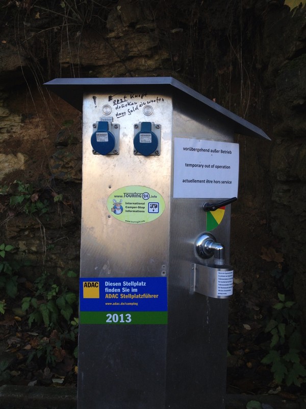 Stellplatz am Sportzentrum Bretten - 4 gekennzeichnete Plätze auf einem öffentlichen Parkplatz bei Schule, Sportplatz, Skateranlage und Hallen-/Freibad - kostenfrei - Versorgung mit Wasser - 1€ / 100 Liter (zum Zeitpunkt des Besuchs ausser Betrieb) - Strom 4 Steckdosen - 1 € / 10 Stunden - befestigter Untergrund, leicht abschüssig - Stellplatzgrösse ca. 3,5 x 7 Meter, Verlängerung der Stellplatzlänge durch Parken des Überhangs über Grünfläche nicht möglich - maximale Stellplatzdauer 2 Tage - unter der Woche tagsüber sicherlich starker Parkplatzsuchverkehr, nachts ruhig - durch den Parkplatz hindurch führt die Zufahrt zu der Sportgaststätte - Entfernung zur Innenstadt ca. 1,5 bis 1,8 km - Anbindung an ÖPNV: direkt vor dem Großparkplatz liegt die S-Bahn-Haltestelle "Schulzentrum" mit direkter Anbindung Richtung Heilbronn / Bruchsal - Bäcker in ca. 800m Entfernung (auch Sonntags geöffnet) - auf dem Marktplatz findet Samstags ein kleiner Wochenmarkt statt Weitere Infos auf der Internetseite der Stadt Bretten --> Link ![]() ![]() ![]() ![]() Es Gibt kein Strom mehr |