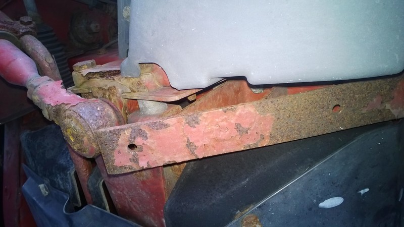Jetzt zum Iveco, Unten nicht so schön wie erhofft, hinten noch OK, ausser die Rahmenverlängerungen, die sehen aus, als wären sie nie behandelt worden. Aber vorne Punkteuell wirkt es auf mcih recht dramatisch, im rechten Radkasten vorne auf dem Hauptrahmen gibt es einen Verbindungsträger, der schön blättrig wirkt, ich versuche mal zwei Bilder einzustellen: