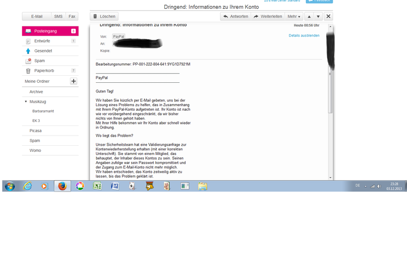 Sehr geil :mrgreen: Guten Morgen ins Forum. Eben habe ich auch so eine eigenartige Mail von PP bekommen. Sinngemäß: Auf Grund häufiger Angriffe auf PP-Konten werde ich zur Sicherheit zu einer Veriverzierung aufgefordert. Tue ich das nicht, wird mein Konto dauerhaft gesperrt. Sieht eigentlich täuschend echt aus, aber ich trau dem Braten nicht. Was ist echt, und was ist falsch. Es wird immer verrückter. Ich stecke bald mein Geld in meinen "Unterdielen - Tresor". :D. Habe die Mail zwar gelöscht, aber ich hatte sie ja geöffnet. Albert moin ich bekam auch von paypal ne mail. absonderliche kontobewegungen würden dazuführen , dass ich nur eingeschränkt über das konto verfügen würde.. ich sollte im anhang meine kontoauszüge prüfen.. nen dreck hab ich getan, hab meine frau zur bank geschickt, und da die auszüge kontrolliert.. sogar von der telecom erhielt ich schreiben, aus meinem mail-konto würden spams verschickt.. das wird mittlerweile zur gewohnheit,, jede woche ein schreiben, tage drauf entwarnung, paar taage später wieder der gleiche käse.. wenn die so weitermachen, und das nicht in den griff kriegen, kündige ich den ganzen sch...und mach nur noch mit preapade karten.. seltsamerweise macht avira-antivir jetzt updates, die zu einem neustart des systems auffordern.. scheint was dran zu sein.. man ist vor nichts mehr sicher,da kannste wirklich sagen :: verfluchte technik, aber das haben sie jetzt davon.. gruß karl